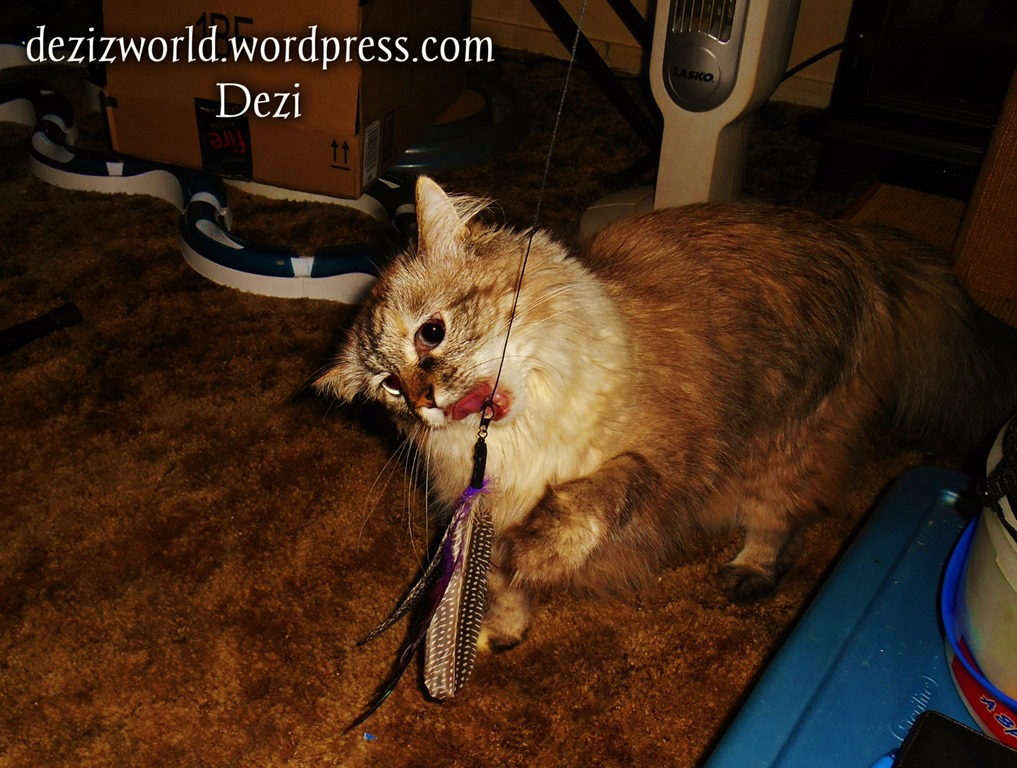 Dezi: Oh Lexi evewy box we get fwum @Chewy is pawsum. And yous don’t know it cuz yous slep wight fwu it, but weez also got anudder little goody fwum amazon.com. We wuz able to get the Bird Catcher Pro fur a dollaw. All weez had to do wuz pay a dollaw and giv a weview. Well weez got it. It fur suwe wusn’t what weez spected, but it wuz a little fun. There wuz no stwuctions on how to put it tugedder, but mommy fixed it bestest she kuld and me wuz all cited. A new toy!! YAY!!!!! It had da cutest little carry case and came wiff a metal rod and 2 diffewent feather toys. Meez fawt it wuz okay, and dat da little stwing ‘tween da pole and da feathers wuz weally enticin’. After all it’s so skimpy me will have it torn in to bits in no time. MOL Meez knows yous seen me chewin’ on da stwing of da mousey on da twee. So weez gav it 3 stars which we considew avewage. It wuz mowe enticin’ while mommy wuz twyin’ to figger it out than it wuz once weez stawted playin’. Weez left ow weview on amazon.com as wequested by da peeps at Pets Can Play Inc..
