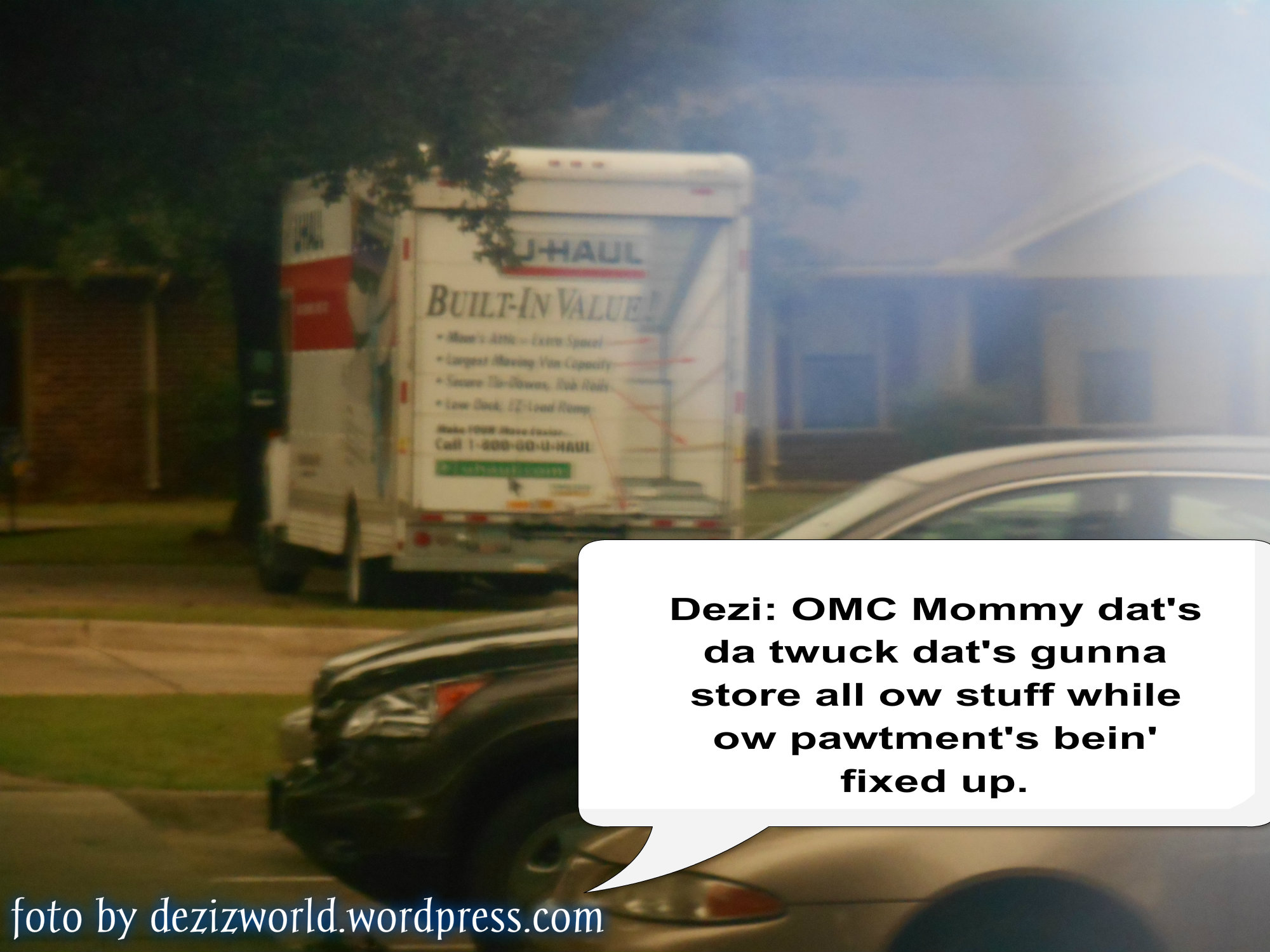Well weez be busy, busy wiff no time to play. Mommy has to do up da laundwy and get all our stuff packed up to take to da motel wiff us. And get all hers stuff packed up to take to da motel wiff us, and then put da fings dat wuldn’t do so well sittin’ out in a locked metal twuck at 100 degwees fur a week togedder so hers can take them to a neighbors pawtmemt hoo offered to let us keep them there. This be da time mommy’s glad hers went digital and has a keyboard stead of a piano. MOL And even tho mommy wuld luv a giant scween T.V., hers glad fur da little 13 incher cuz movin’ it be so much easier. Mommy duz say dat sumday hers hopes to finally join da west of da hooman race wiff a t.v. dat hers can actually see wiff out readers. MOL But dat’s a stowwy fur anudder time.