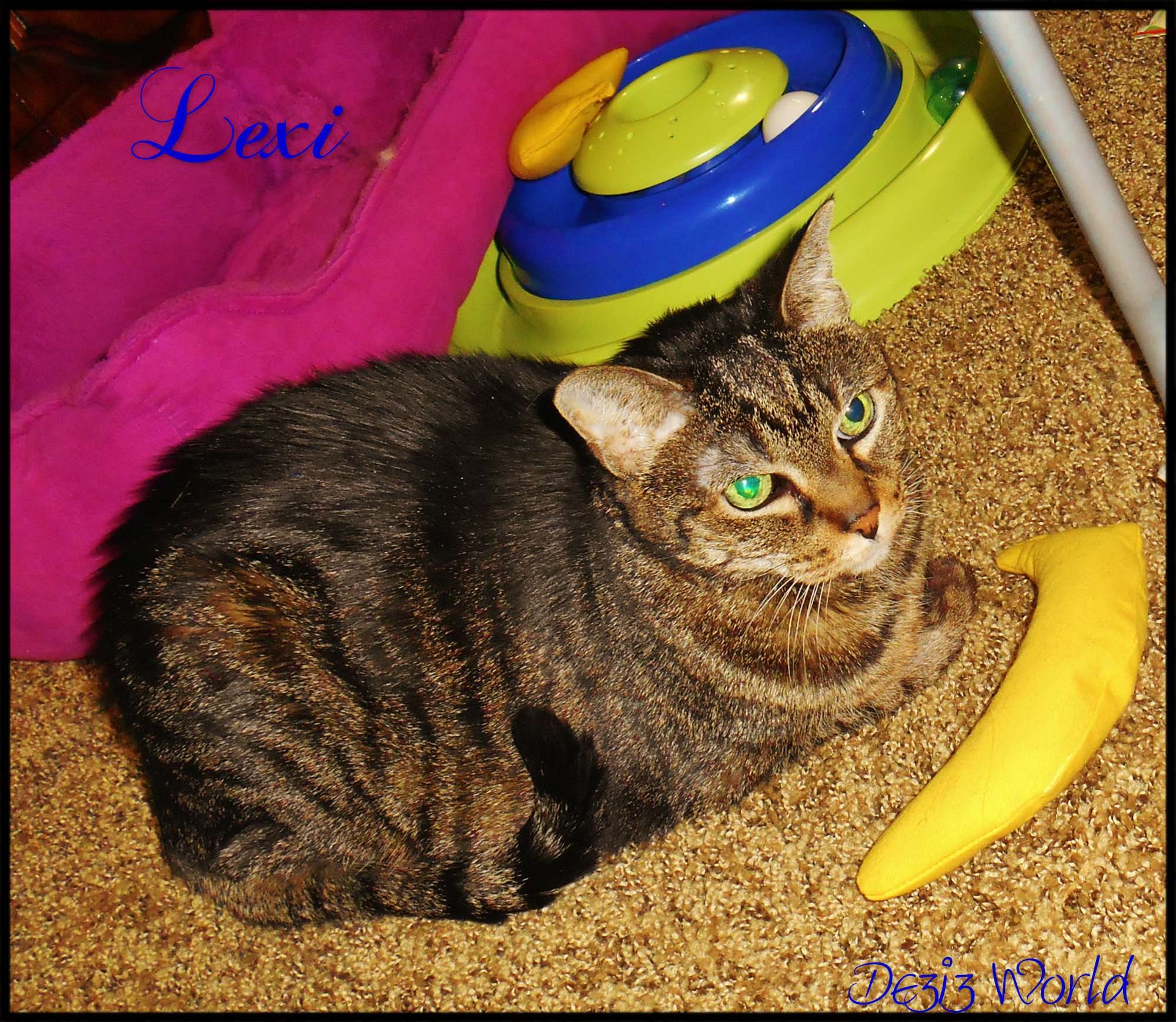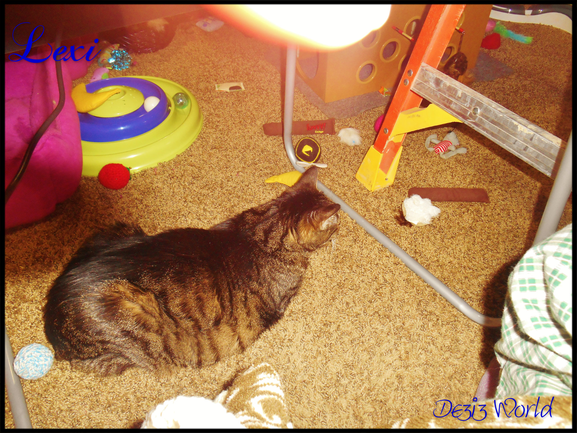 And then…there wuz mommys hands gwabbin’ onto me. OMC Meez had to show off too, so me Hissed da biggest hiss me kuld get out to show meez dispurrleasure. Then mommy sed in dat voice, you know da one, so sugawy sweet it’s posed to mask da bad fing dat’s comin’. “Oh Dezi you’re way too purretty to be actin’ like this. I promise you’re going to love awnty Ann and hers furiend.” And against meez purrotests down da hall to da livin’ room we went. And then me saw them, 2 very purretty ladies; lookin’ down da hall at me and cooin’. Aha Take dat sissyfur, they fink meez bootyful too and dat me has gawjus eyes too. And then they offered soft hands and stawted pettin’ me. Well this ain’t so bad after all. At least they’re much purretier than da lectwic men. They smell better too. So when mommy put me down me had to show off meez belly and meez rollin’ in da nip nana technique. And me had to check out da new purrses in da house. Not nearly big nuff to hold me, but they did hav sum innewestin’ smells. So me had to add meez own smell to those dat wuz alweady there. Hmmmpht When they get back home their furries awe gunna know dat they cheated fur sure. Meez gunna make certain of dat. MOL