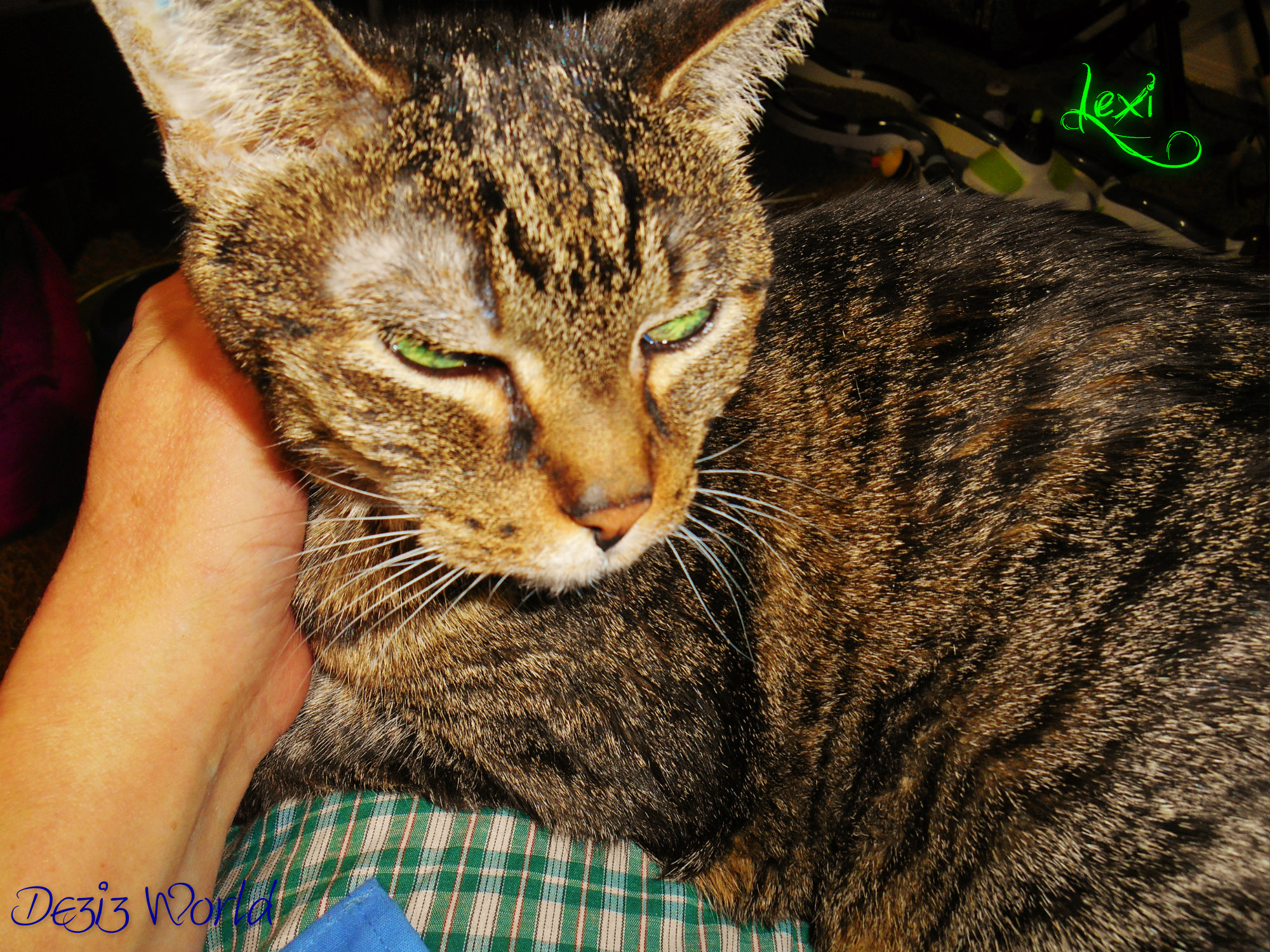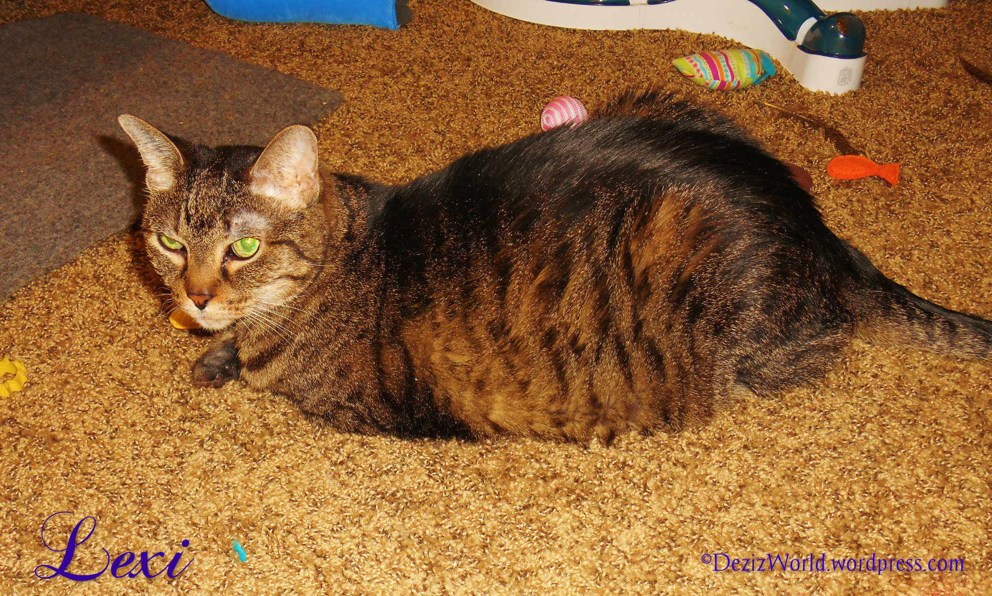 We’re both getting older now my sweet, and the gray hairs are creeping up and sprouting on both of us. But every time I look at you I still see that little kitten that fought so hard to live. I never had much in the way of money so you didn’t have every new toy that came out or pawsum cat furniture to play on. But Lexi my green eyed angel girl, you never lacked for my love.