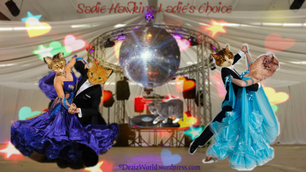 Meowllo and Happy Valentine’s Day to yous all. It’s time fur da Sadie Hawkins Dance over at da Tabby Cat Club. Sis Lexi wanted to host this pawsum dance and so mommy did evewyfin’ hers kuld to help her get it all put togedder. So go on over and check out da fun. Gwab a dance and sum gweat suddern noms and a glass of catnip sweet tea or champagne.