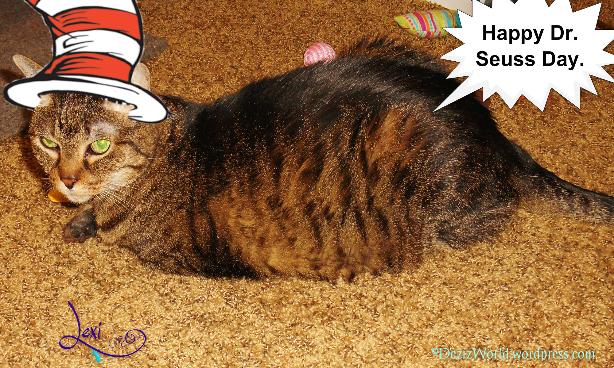 Meowllo evewypawdy, hope yous havin’ a gweat stawt to da week. As we unnewstand it, today we be celebwatin’ Dr. Seuss day all acwoss da blogosphere. Weez also celebwatin’ at da Tabby Cat Club and Cat Scouts. Now when we got da furst email fwum Miss Ann, we wuz a little emabawwased cuz we had to write her back and ask just who wuz this Dr. Seuss and what wuz this ‘bout. Mommy sed she vaguely membered sumfin’ ‘bout a gwinch and Christmas. But hers favowit Christmas show is/wuz da Little Dwummer Boy. She didn’t know this Dr. Seuss wuz a weal purrsun and dat hims wuz a writer. Mommy didn’t hav da same kinda childhood as a lot of ya’. Her wusn’t beat on or nuffin’ but fings wusn’t always as they seemed. So anyways, Miss Ann gave us a link to hers bloggy where she had helped lots of kitties in da past wiff their posties. We gotta tell ya’ they wuz pawsum. Dat Miss Ann is one talented lady.