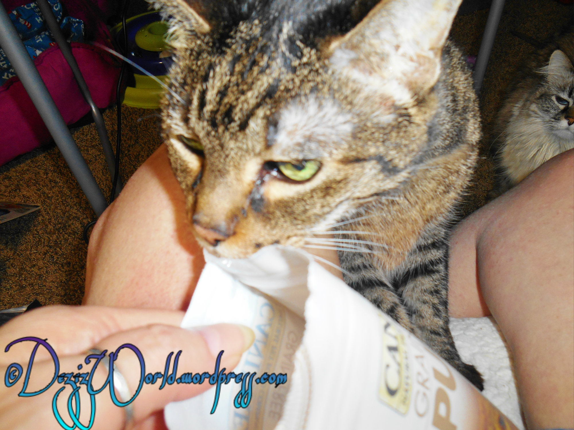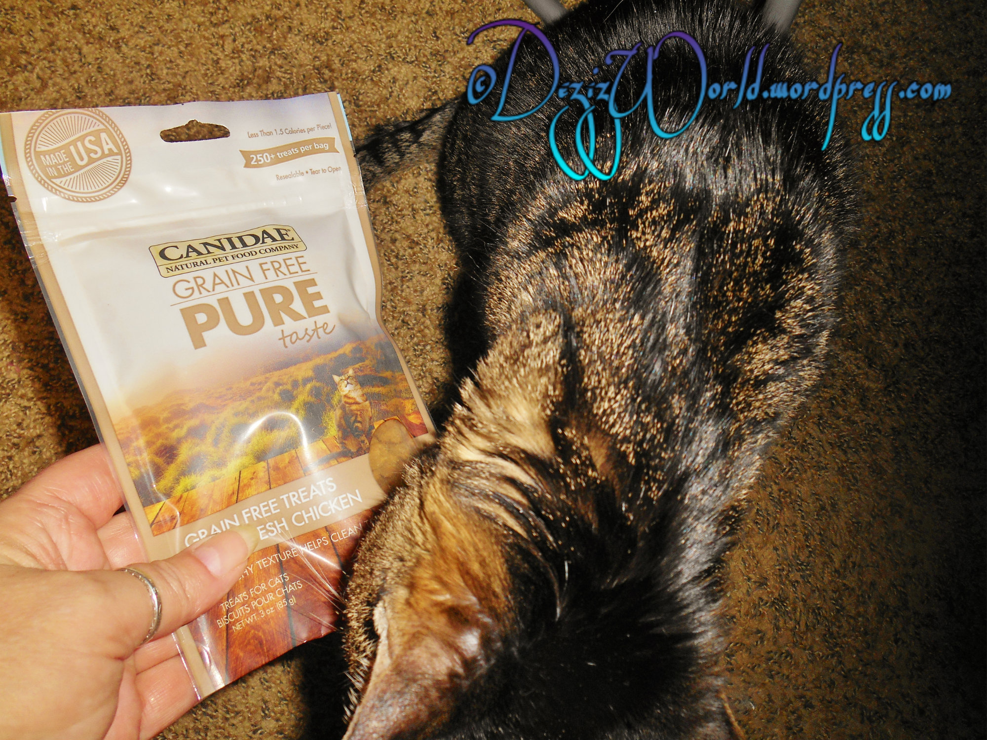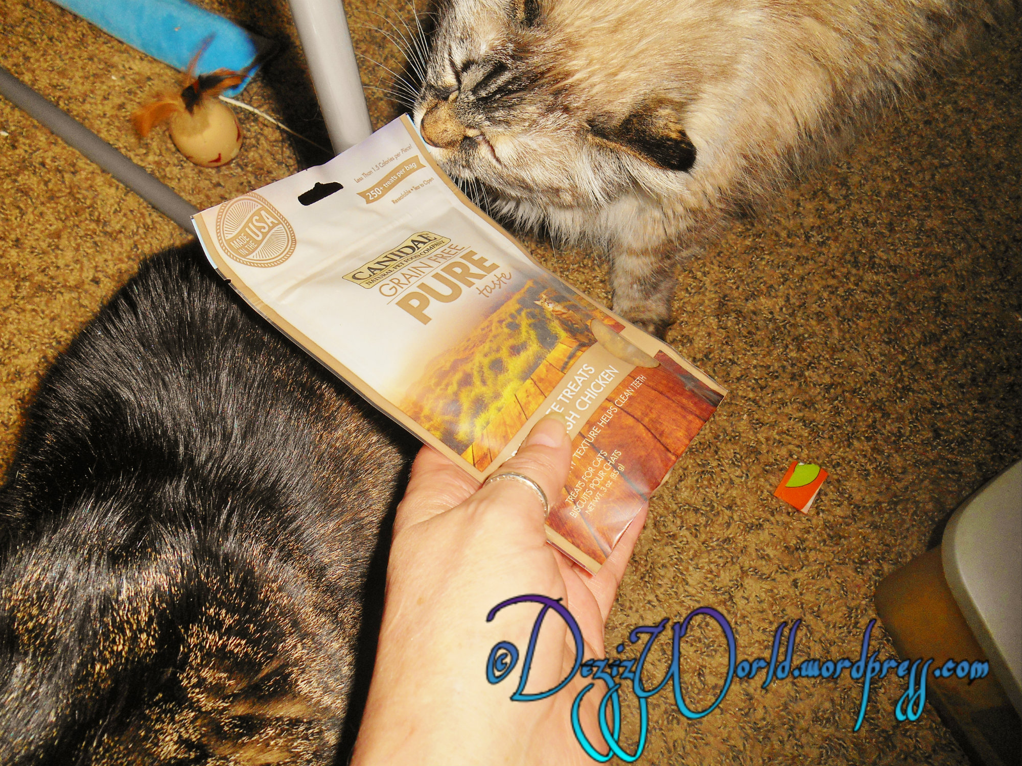 We got ow package fwum chewy.com and at da time we wuz boff nappin’, so mommy set iit down and went back to whatevew her wuz duin’. A foo hours passed and sis Lexi came up fwunt to let mommy know she wanted a tweat or sumfin’. Since she lost so much weight weez been getting’ a foo extwa tweats off and on fwu out da day, and so she wuz wantin’ sum. Mommy pulled out da Chewy.com package and opened it up and took out a bag of tweats. Well soon as me heard dat wumblin’ oof da package me wuz off da top of da cat twee and wight beside sissy. Mommy took a kupple fotos and then opened one of da packages. Oh da smell of divine goodness. Me stawted meowin’ and sissy stawted gwabbin’ at da package. Mommy laffed and sissy stawted meowin’. Mommy wuz takin’ faw too long. Finally she got da package of tweats open and poured a foo in hers hands and…Wow wuz they evew good. What were they you ask? Well let me just tell ya’. Da name of this pawsum goodness is Canidae Grain Free Pure taste wiff fwesh chicken.