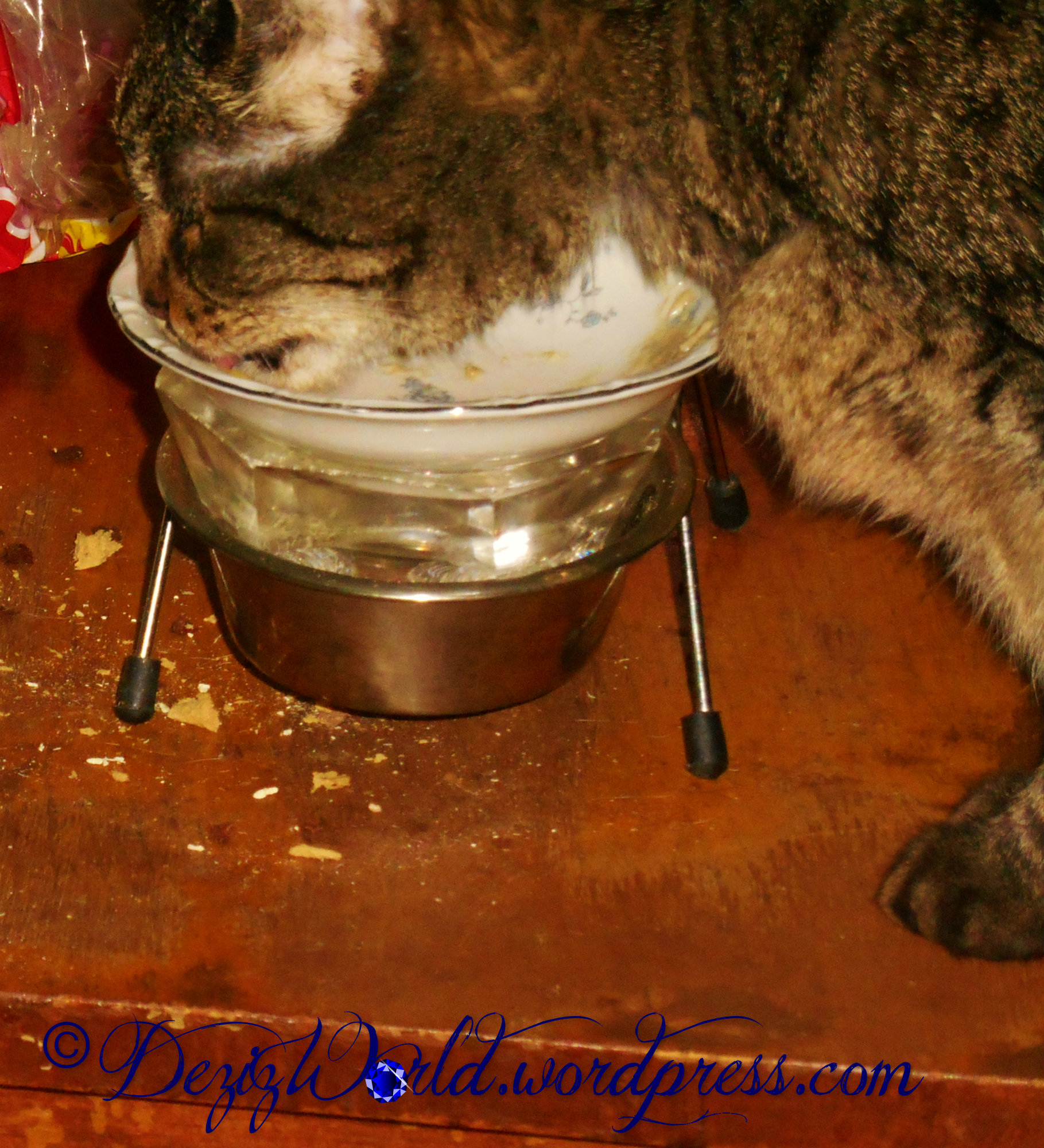 So anyways mommy and me headed fur da kitchen to fix bwekky. As me sed mommy be getting’ wound purretty slow these wet, rainy days, so it takes furever to make bwekky, so me stands watch. And sumtiimes me will have a good scwatch on da post, but me can still see and feel mommy so ifin she needs me it’s no purroblem. And sure nuff this meownin’ she needed me. Mommy was twyin’ to hurry and get our bwekky made and suddenly me felt dat sumfin’ wasn’t wight wiff mommy. So into da kitchen me went and pawed at hers ankles and meowed and twirled. See mommy likes to twy to stand up and fix our bwekky. She leans on da counter to stabilize her. But ifin she passes out, it dusn’t matter what she’s leanin’ on, she’s gunna fall. So after me danced a little me got da chair and bwought it over to her so she kuld sit down and finish makin’ bwekky. Bwekky all dun and me hopped up in hers lap to have me sum ham spoon and mommy hollered fur sissy to come eat.