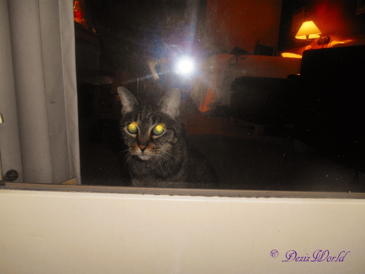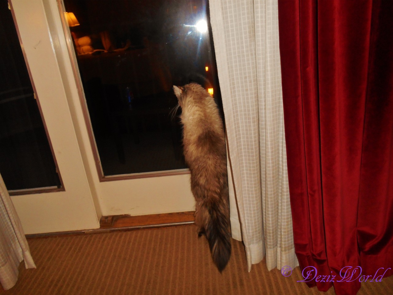 Meez lookin’ out da slidin’ door in our room onto da balcony.