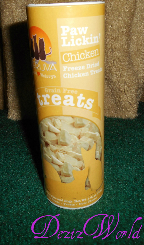 We was so ‘cited to get our Chewy.com weview box this mumff cuz inside was sum fureeze dwied tweats fwum nun udder than Weruva. Yous al know how much we like da fureeze dwied tweats and dat we wecently learned all ‘bout da yumminess of da Weruva noms; so we fawt fur sure these tweats was gunna be pawsum. They be called Paw Lickin’ Chicken. And yep, they leave off da “g” just like we do, so we felt a kindwed spiwit. (MOL) And they have a canned nom called Paw Lickin’ Chicken dat we luv, luv luv. So we kuldn’t wait to sink our teefies into them. OKay maybe me kuldn’t wait to sink meez teefies into ’em, and sis Lexi was hopin’ to gum ’em. They came in a tall cylindwical cawrd board tube dat contained 1.91 ounces of fureeze dwied chicken bites. It took mommy a few minutes to figger out how and which end to open, but she got it open no purrawllem. And me was standin’ by to twy whatever she bwought outta dat tube.
