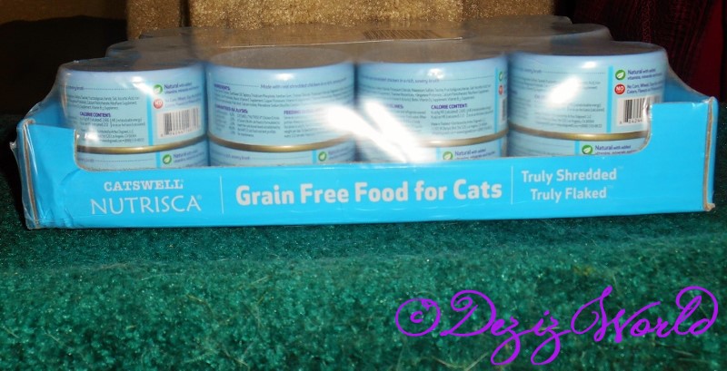 Da day came when our chewy box awwived. Me was ‘cited cuz we had a new box. We had wecently had an inspection and so mommy had to fwo out all our boxes. (‘cordin’ to da management, boxes be a fire hazard.) Anyways, mommy opened da box and pulled out da case of Catswell Nutrisca noms. Me had a good sniff and went off to play in da box while mommy had a mini foto shoot wiff da cans. Dinner time was still a ways off so mommy went online to see what she kuld find out ‘bout this new cat food and da company dat makes it. Turns out da pawent company called Dogswell is fairly new. They was founded in 2004 when they developed their furst purroduct, a dog tweat wiff glucosamine and chondroitin. Now they make food and tweats fur boff cats and dogs; da newest bein’ da Nutrisca Grain Free canned noms.