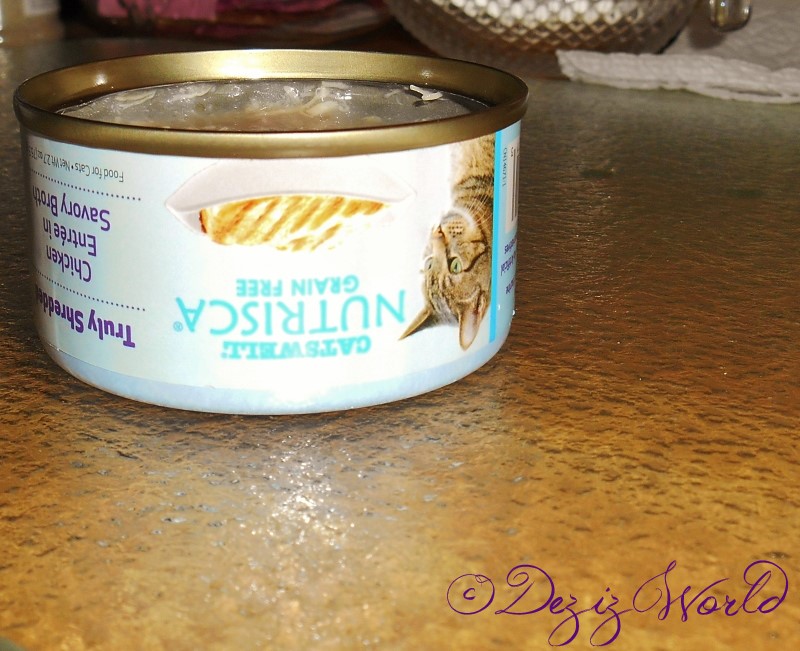 Well as you know weez pawrt of da Chewy.com blogger purrogwam and very gwateful fur dat; so when we got da list of choices this mumff we tentatively aksed fur da Catswell Nutrisca Grain Free Chicken Entre`e in Savory Broth. It comes in 10 different flavors and costs less than $22.00 fur a case of 2.7 oz. cans. Me eats purretty well so mommy dusn’t worry so much ‘bout me but when sissy be eatin’ we don’t like to upset da kitty by changin’ fings up. But at da time sissy was eatin’ nuffin’ but tuna and you know how much mommy hates fur us to eat tuna, so she was weally hopin’ Lexi wuld not only like this new food but dat it wuld kick stawrt sissy into eatin’ udder purroteins again. Dat’s a purretty big burden to put on a little ole can of noms, but we was purrayin’ and believin’ it wuld work out.