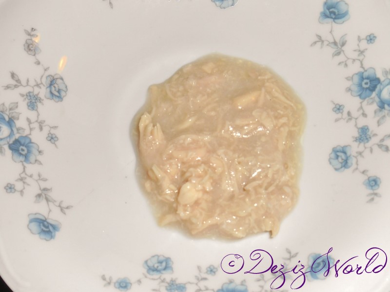 Dinner time finally awwived and mommy gwabbed a can of these new noms and pulled da tab. Sis Lexi immediately stawrted meowin’ fwum her place at da table and me chimed in while rubbin’ mommys legs. As mommy duz wiff all our weview items she pulled out da flashy box and stawrted wiff da foto shoot. You know me dusn’t know why she has to do this when we be hungwy and waitin’ on her to fix our plates. Finally on da plate, mommy had divided da can ‘tween us; she set our noms in fwunt of us. Mmmmmmmm nom, nom, nom. This is good mommy, me meowed fwum meez plate. So me gives it 4 paws up. What ‘bout sissy you ask? Well let me tell ya’.
