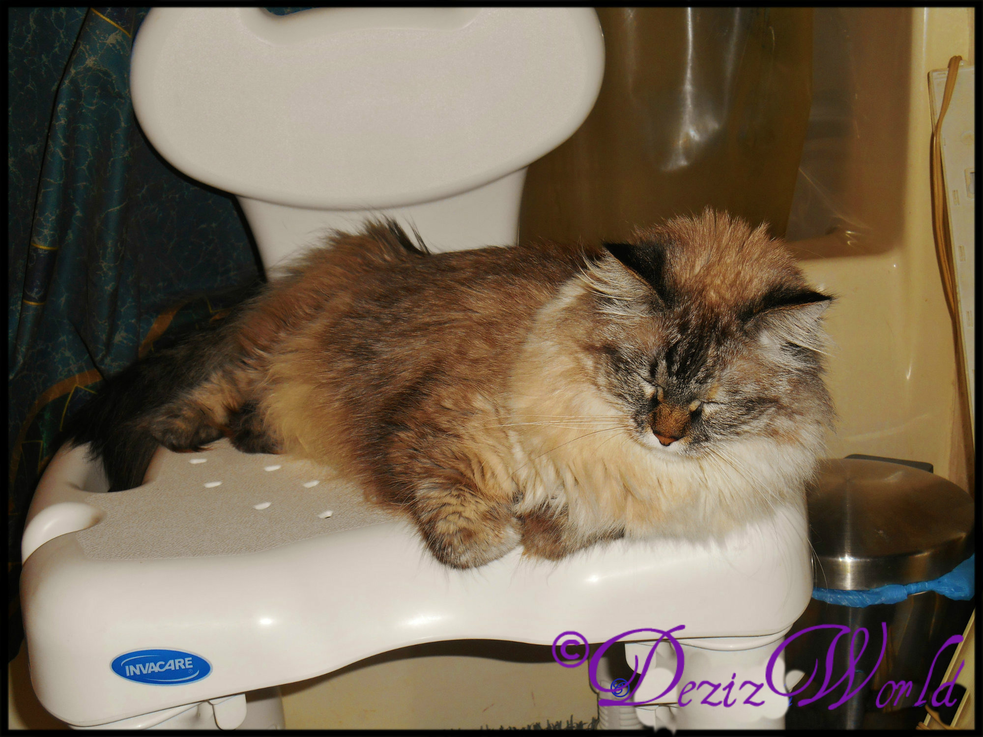 Da next meownin’ when we all woke up Dezi and me gave mommy herz meownin’ get it in gear massage and rolled her to da chair. Az soon az mommys hiney-bo hit da seat, Dezi hopped over in herz lap and started meowin’. Mommy started to move Dezi over and told me to get in the chair cuz she really needed to go to da pawdee room asap. So I’z crouched to jump into mommyz lap in da chair, and Dezi bit down on da joystick and pushed. Da chair turned and took off like lightnin’. I’z took a small leap and landed back on da bed cuz da back of da chair was facin’ me and movin’ away fazt. Mommy started hollerin’, “Lexi, baby, are you okay?” I’z stood up awl startled and dizzy like when I’z heard a loud boom, and looked over towardz mommy, and she and Dezi wuz safely in da pawdee box room. They had hit da baff tub, but they wuz there and safe. I ran too them and Dezi wuz wigglin’ herz suthern belle little (huge) hiney bo and getting’ awl kinds of prayz and lubbin’. Dezi be awl ‘cited dat she had gotten mommy to da pawdee box room. Purrleaze, youz gotta do it more din once afur youz get to celebrayt like dat I’z told her. Youz know any kitty can habz a freak accident. When she can do it ebbertime wiffout runnin’ into ebberfing in da houze thenz when it’ll beez time fur celebraytin’. I’z hope youz awl enjoyed minez tellin’ of Deziz furzt success.