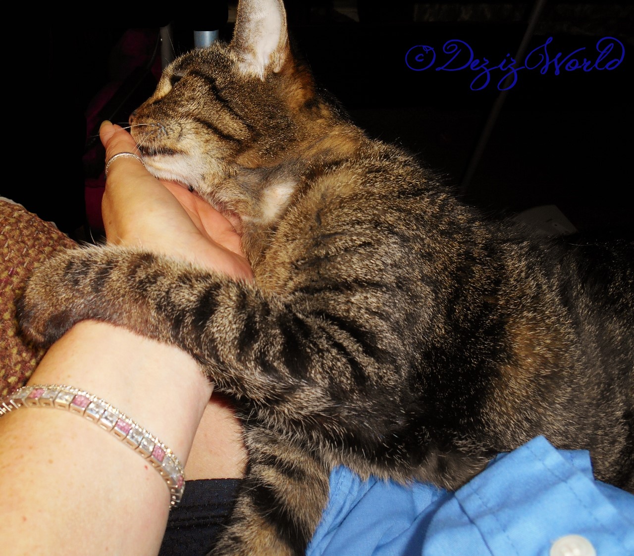 Faynkz Dezi. Now az you awl know Dezi iz kwite comical but I gotta tell ya’, at da time I wuz wunderin’ ifin she wuz ebber gunna lern to drive da chair or ifin dat wuz awlwayz gunna be minez job. She didn’t awlwayz seem like da crizpezt cracker in da package. So mommy had used luv and nip and now she ‘cided to use treatz. Awlrite, I’z luv treatz. Maybe thiz konztant traynin’ wuz gunna be a good fing after awl. Mommy gave us boff a kupple treatz and then put da bag in da little pouch on da arm of da chair. So here we iz boff sittin’ in mommyz lap lickin’ our lipz and tayztin’ da lazt bit of treet and mommyz reddy too trayn. Well Dezi had udder ideaz and…Well it went sumpin’ like diz…