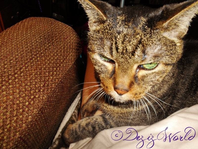 So later dat day mommy got all set up fur a twainin’ session up da hall. Mommy had ‘cided dat tweat twainin’ purrobly wasn’t da way to go cuz we got too sidetwacked. Mommy isn’t fond of tweat twainin’ in general cuz havin’ a tweat on her all da time just isn’t pawsible and what we be learnin’ isn’t a twick to be purrfurmed like jumpin’ fwu a hoop. So anyways, mommy had put da tweats away and pawsitioned da chair at da edge of da pawdee box room headin’ out when she called to me. Of course me came runnin’ and jumped up in mommys lap. Me weally luvs meez mommy and wuld hang in hers lap all da time ifin me kuld. Mommy got me situated on hers wight leg and told me to turn on da movin’ chair. Me stawrted rubbin’ mommy and da awrm of da chair wiff meez head and purrin’ like a motor boat. Mommy caved and stawrted luvvin’ on me.