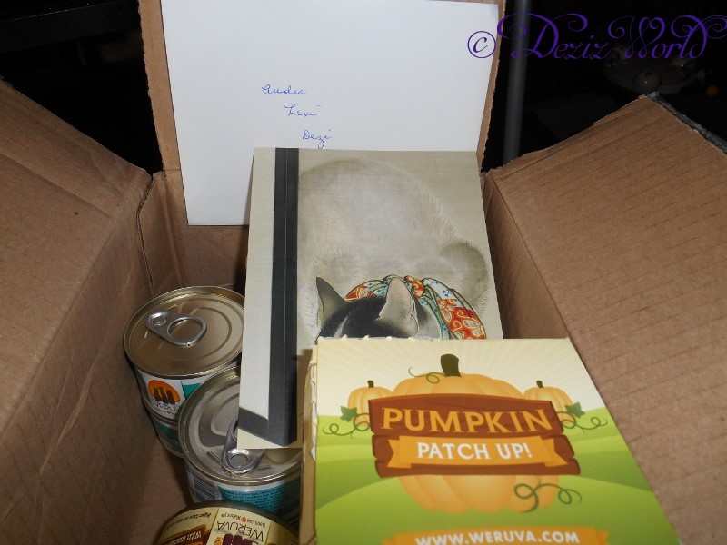 Well weez have a weal tweat fur yous today, in more ways than one. You all know how much we luv da Weruva noms wight? Well they contacted us and asked ifin we wuld like to tell you all ‘bout one of their newest purroducts da Pumpkin’ Patch Ups. Well of course we wuld. So weez wrote ‘em back and sed yes, we luv da punkin’ purroducts. So they told us to be on da look out fur a goodie box. WooHoo, they have sum gweat goodie boxes.
