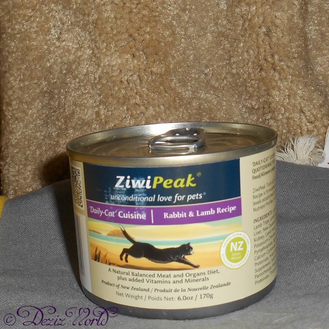 Inside dat box was a whole case of Ziwi Peak Rabbit and Lamb canned cat food. Let me tell ya’ they don’t skimp on size eever, each can be 6 whole full ounces. Now there be sum mixed infurmation out there ‘bout Ziwi Peak Cat food so let me tell ya’ a little bit ‘bout it. Da ‘Daily Fresh’ canned cat food be made wiff 100% natural raw meat and contains none, zero, zip, nilch of those controversial ingredients like da carrageenan. Ziwi Peak mirrors da wild-prey diet dat  fits a cats carnivorous needs. Remember it’s made from raw meats to mirror da wild prey model, so it duz contain bone. It’s high in protein and fat from honest to goodness real meat. Fur dat reason tho’ you may wanna innerduce it slowly, specially ifin your kitty has been eatin’ a lower quality food. Such natural goodness kuld upset kitties tummy a little. But not to worry it’s not cuz da food be bad or nuffin’ like dat. In fact, Ziwi Peak was included in a test of 1.759 cat foods and came out in da top picks list. You can view dat list and da testing involved here. So now on wiff da eatin’.