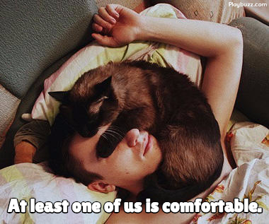 My cat and I are BFFs. We do everything together – play, eat, snuggle – we make a purrfect team. But in the bedroom, I prefer to have my space. My cat, on the other hand, thinks there’s no better place to sleep than right on my head! Why does she do this? I’m not all that fun when I’m sleeping.