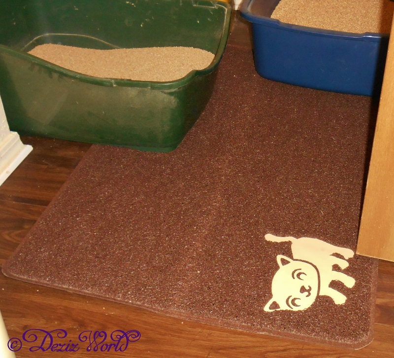 When da mat arrived it was rolled up and had to be flattened out. No real problems there. We had one corner dat kept wantin’ to curl, so mommy sat it under one of me’s scratchers overnight and it was ready to go da next day. Da mat itself has a cute kitty in one corner and really short pile. As me said, we received da brown and it’s a true chocolate and looks really purretty with a cream colored kitty in da corner. These could also be used as door mats. Once we got it placed by da litter boxes we realized it was a bit smaller than we had expected. But ya’ have to remember, we have da giant litter boxes fur giant kitties.