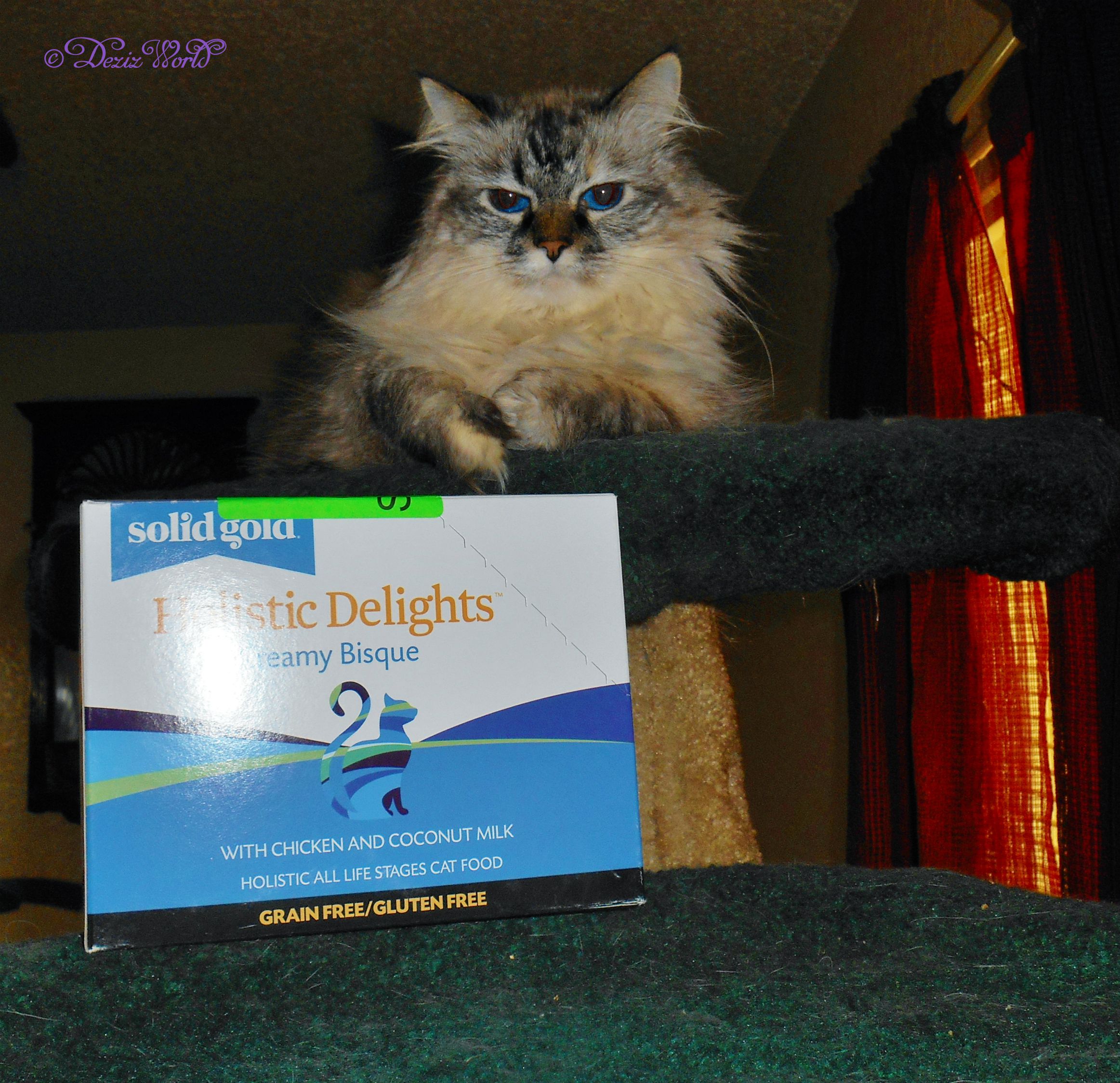 So, dat bein’ said mommy chose da Solid Gold Holistic Delights in Creamy Bisque with chicken and coconut milk. Now these come in 3 ounce packets, 12 to a case for $14.28. They are all grain free and da chicken bisque we received also says it’s gluten free. And as me said befur, it’s appropriate fur all life stages. Here’s what’s in it: