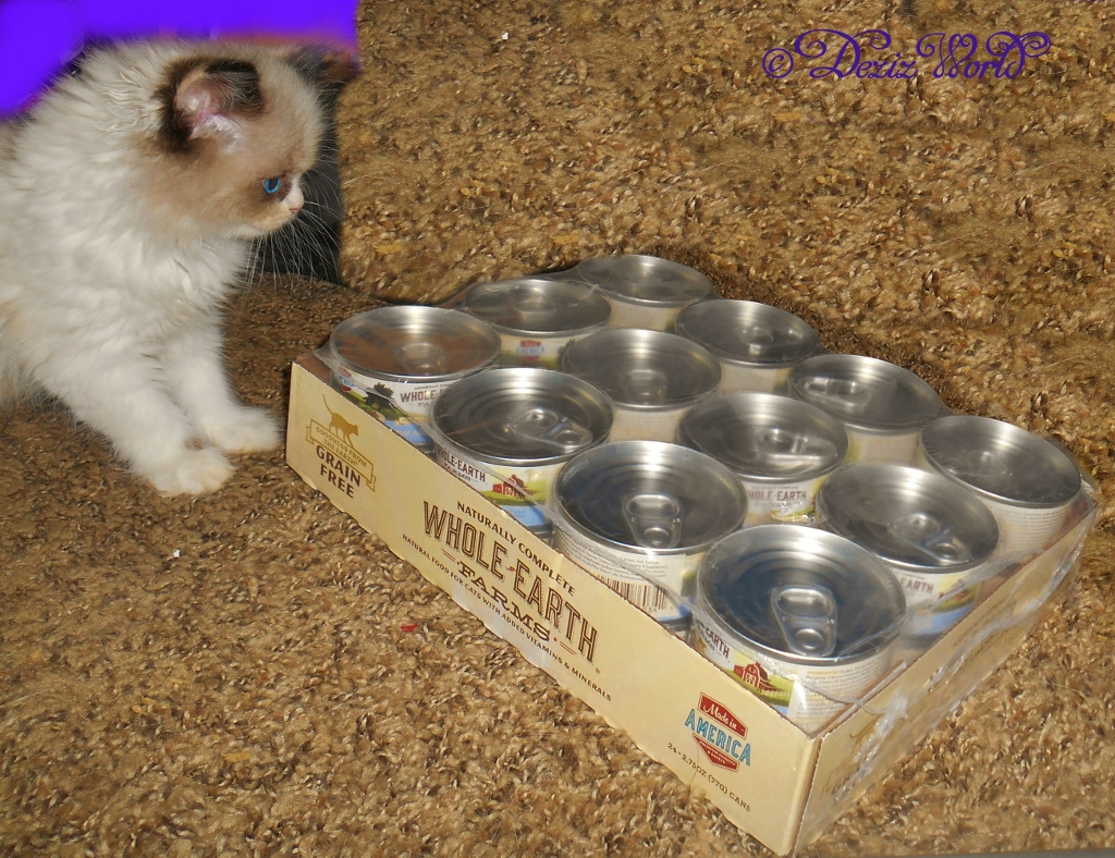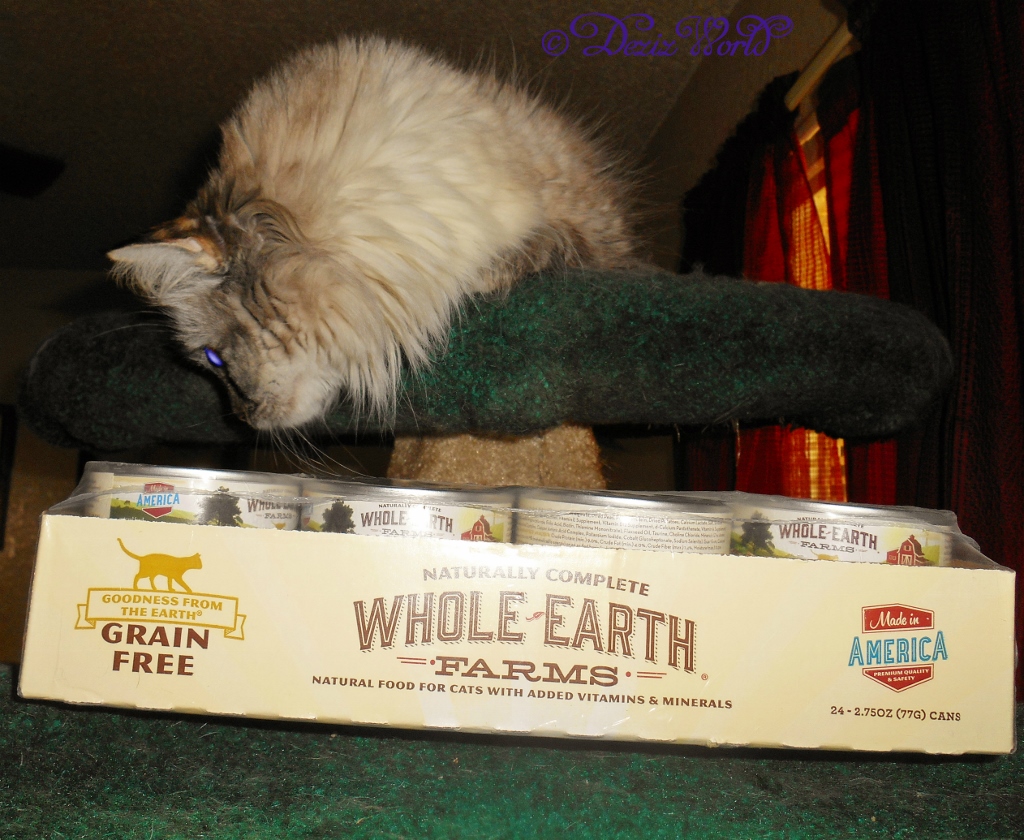 As me told you befur, when we got da list of offurings this month, mommy checked them all out and picked a food dat was good fur all life stages. With me bein’ an adult and Raena bein’ a kitten, mommy wanted to be sure da noms we tried would be appropriate fur both of us. So we got a case of Whole Earth Farms Grain Free real chicken recipe canned food. This food and da name were new to us, so we checked ‘round and found dat Whole Earth Farms are a pawrt of da Merrick Pet Food company dat was recently bought by Nestle Purina Pet Care.