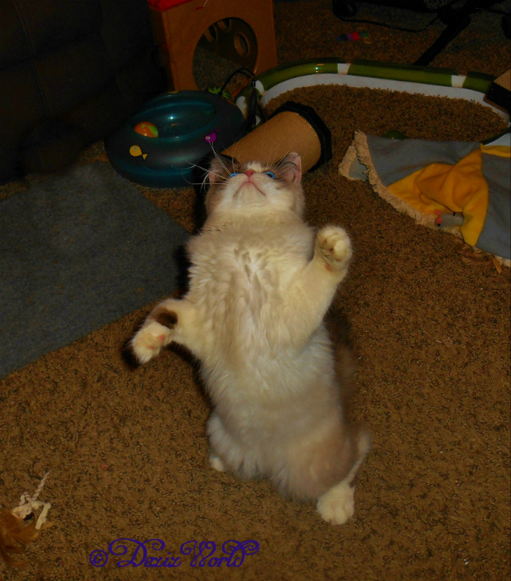 Raena: Well you know peeps are always askin’ ‘bout how we’re getting’ along, and several even suggested dat you might have caused mines eye to hurt; so I’s wanted to tell everypawdy ‘bout our relationship. I’s luvs, luvs, luvs mines sis Dezi, and truth be told she luvs me too. But, I’s also a rowdy, energetic, non stop kitten dat thinks sneak attacks, even when sis Dezi’s in da pawdee box, are great ideas. I’s luvs standin’ and walkin’ on mines back paws so I can look huge and flail mines arms ‘round in sissys’ face. Sissy doesn’t find dat amusin’ at all and generally hisses right in mines face. But I’s know she still luvs me, cuz ifin I’s get quiet and she can’t see me, she goes thru da house lookin’ fur me. And when I’s not feel good, she takes great care of me. I’s just wanted you all to know dat we’re gonna be da bestest of sisfur furiends ever, but some things aren’t gonna happen till I’s learn to act a little calmer.