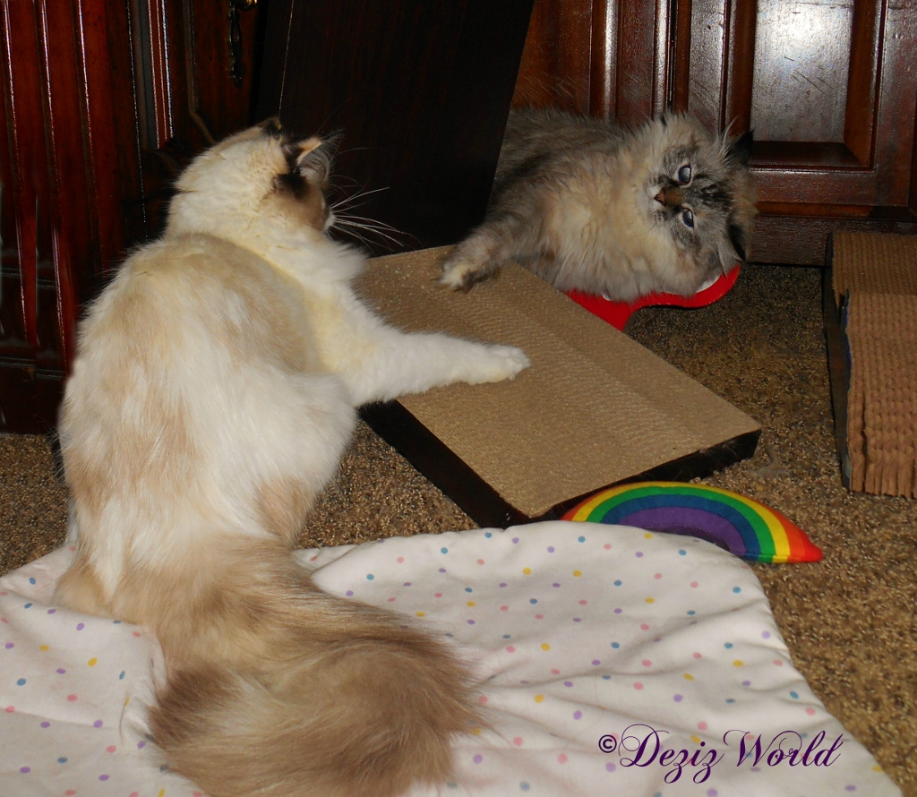 When we all woke up Fursday meownin’ there was a bit of a chill in da air. So mommy grabbed a pair of socklets on our way to da kitchen. She made up our brekky and settled into her sittin’ chair so we could eat and she could enjoy a cup o’ joe. Raena and me settled in to our plates and started chowin’ down. Me saw mommy puttin’ on those socklets outta da corner of meez eyes, and thought nuffin’ of it. Raena on da other hand has never seen socks of any kind.