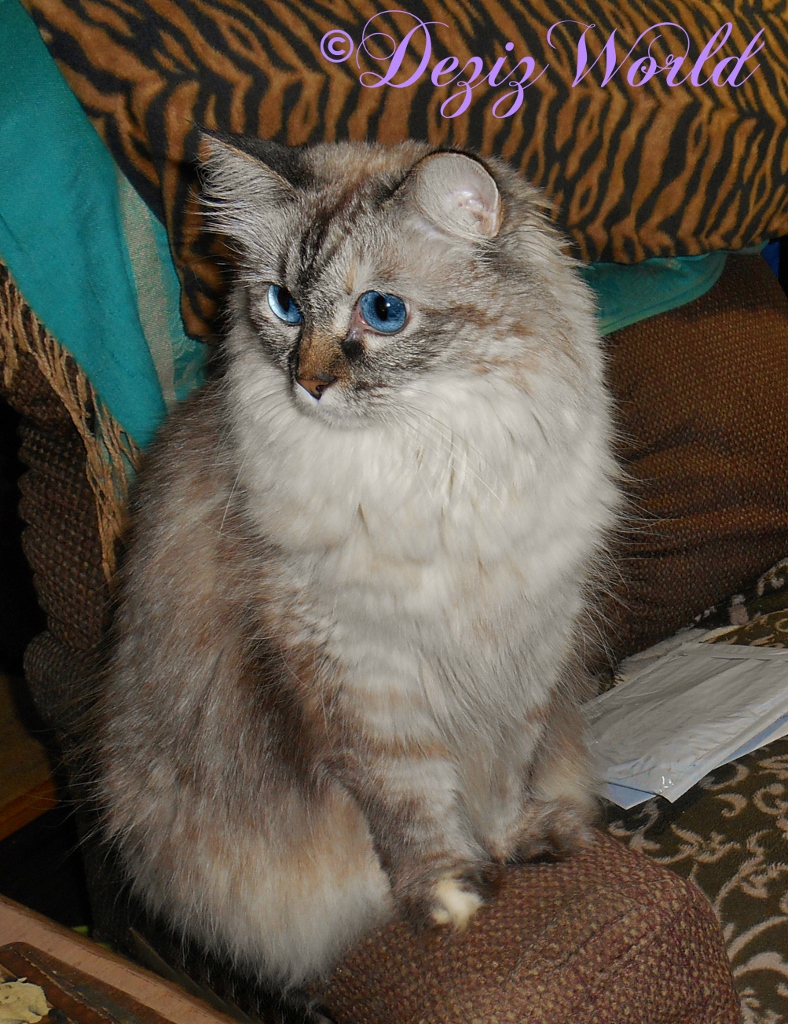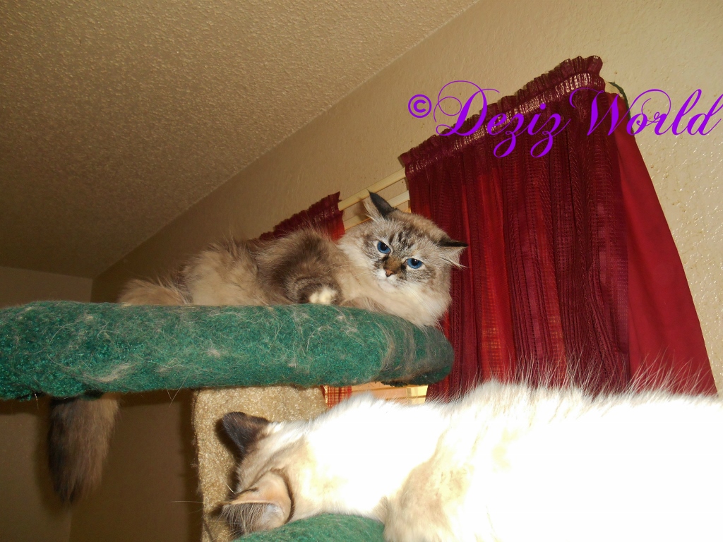 All tethered in, mommy and Raena headed out da door. Me decided to take a quick bath and a nap befur it was to be me’s turn. Me could see them strollin’ ‘round and stoppin’ fur da occasional foto and to inspect da odd noise or chirpin’ birdy. Furinally they headed back in. Mommy let Raena out and took off her harness and told me it was mes turn. Me came down da Liberty tree to a shelf where mommy could reach me. She put on mes harness and da leash and plopped me in da stroller.
