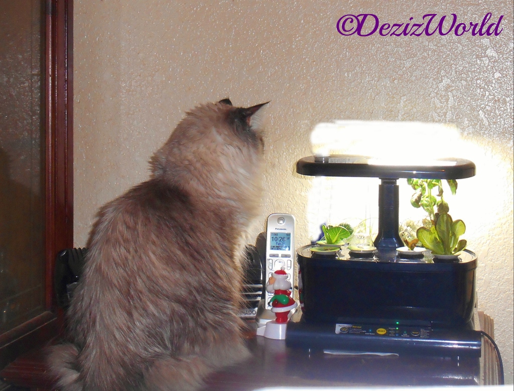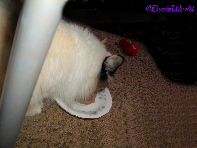 Can you believe mommy’s never had a mousse? Well, she hasn’t, so she didn’t really know what texture this food would be till she opened the cup. Mommy decided to offur Raena and me a half cup each fur our mid afternoon snack. Mid afternoon snack is code fur Treat Time, that we usually eat on the cat tree and without plates. So to say we weren’t quite sure what to do with this “treat” is puttin’ it mildly. Uh, Where’s the freeze dried bits mommy? That was the question Raena and me were askin’ when we looked at our plates. So, mommy took the plates away and decided to offur it as a meal instead.