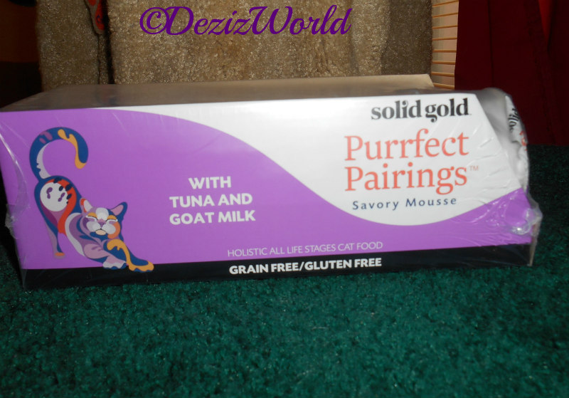 Sur-purrisingly, mommy was a little on the happy side ‘bout that. Her eyes then focused and she realized that wasn’t mouse at all, but indeed, mousse. The Purrfect Pairings come in 6 different flavors and are a whipped mixture with goat milk to make that mousse texture. Much to mommy’s chagrin, all 6 flavors contain Tuna Fish. As you know, we don’t get much fish here, but mommy decided as a little treat every once in a while, this would be okay. Since tuna was in all the flavors, mommy decided to go all out and we got the Solid Gold Purrfect Pairings Savory Mousse with Tuna and Goat Milk Grain Free Cat Food Cups, 2.75 ounce. They come 6 to a case fur $8.34 and are also gluten free. Let’s see what Chewy says ‘bout these delectable treats.