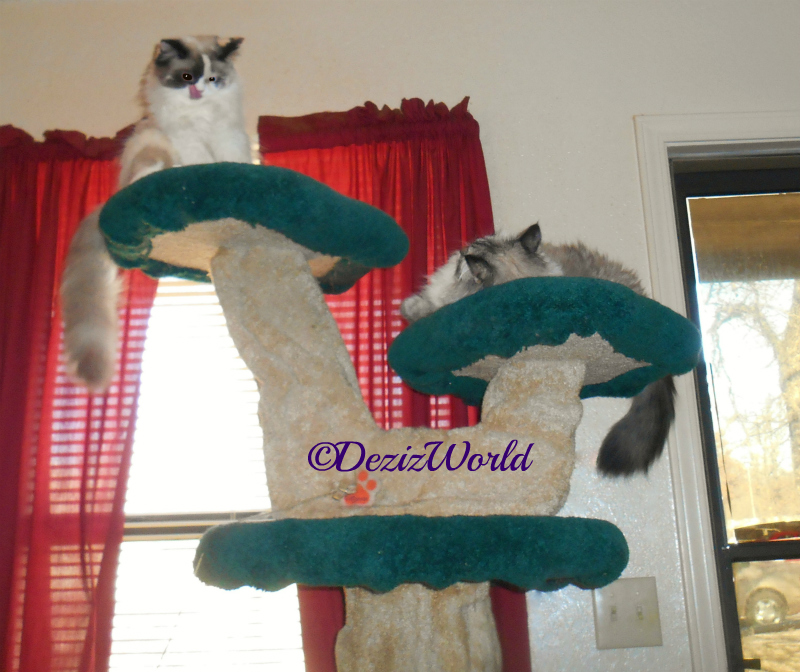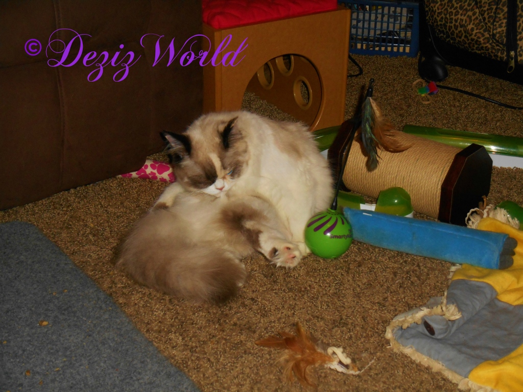 (Raena starts zooming thru the house again, and gathering up toys. She sits down to have a bath and meows at Dezi.) Oh MeOW I’s gotta floof up and have a quick bath. Sissy, will you put out the Yeowww toys, and maybe some of that yummy silvervine? Do all our ‘lectric toys have furesh batteries? Can you wave the wand toys fur us? Can we play on the Liberty Tree? Do you ‘member what Simon’s favorite treat is? Surely he’ll like our freeze dried chicken breasts. Maybe…