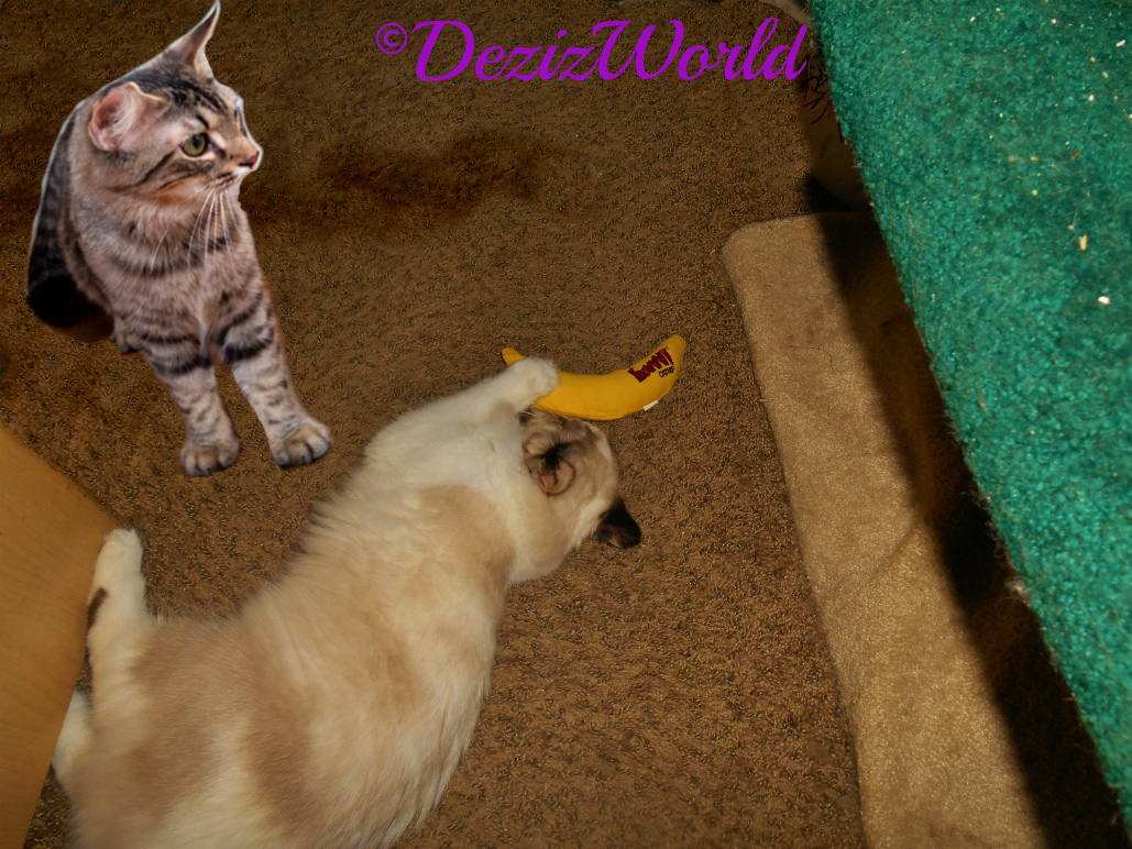 Fanky fanks sissy. C’mon Simon, do you like the Yeowww nip nanners? We’ve got 2, so we can each play with one. Feel furee to empty the toy basket, I’s do it all the time. MOL