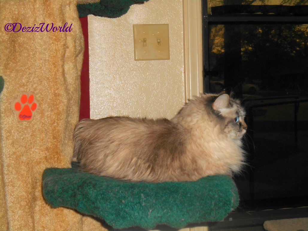 When she bit the joystick she also turned her head just enough to pull the joystick backwards. Mommy, Raena and the wheelchair all jolted backwards and right into our brown cat tree. The tree shook and stopped the chair, and Raena jumped from mommy’s lap to the tree. She had released the joystick as soon as the chair started moving. Mommy started petting air and apologizing to air Raena. Real Raena was looking on from the brown cat tree right behind mommy. Mommy finally realized Raena was no longer sitting in her lap and looked around for her. Mommy can’t turn her head to see behind her, so she couldn’t see Raena sitting right behind her. Of course, we’re not so sure mommy could see anything with her hazy eyes.