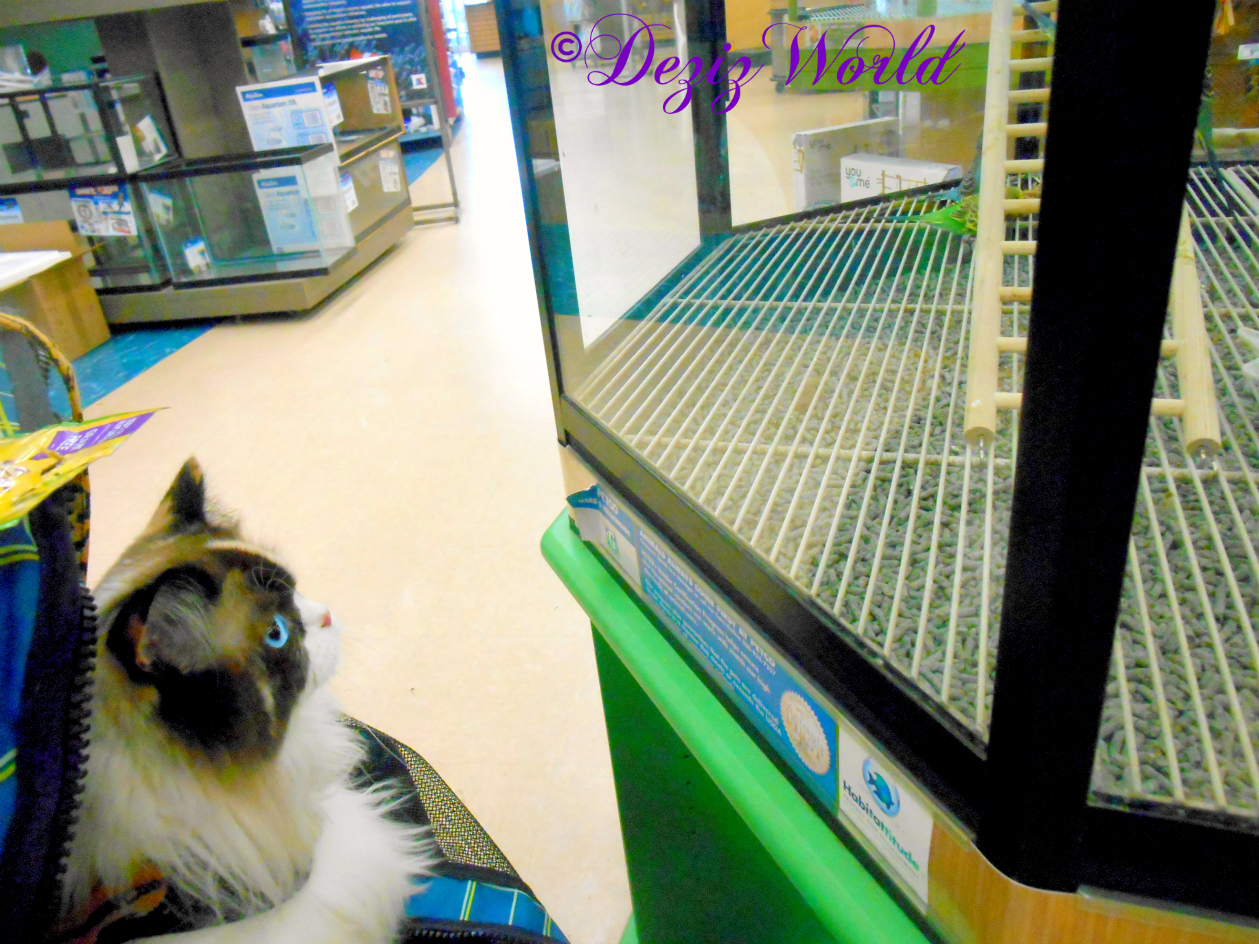 Anyways, mommy bein’ the pawsum mommy she is, put on her happy face and to Petco we went. What a time I’s had. I’s got to walk ‘round all the kitty scratchers and platfurms. And did you know they have a big plastic see thru box with birdies inside? OMC You shoulda seen all the birdies. There was blue ones, yellow ones, and even some green ones. I’s never seen birdies that colorful befur. The birdies that hang ‘round here are all brown or black. I’s couldn’t seem to find the way in to that box, so I’s didn’t get to play with the birdies. Trust me, it wasn’t fur a lack of tryin’. And then, mommy took me over to see real live mouseys. I’s never seen a real live mousey befur. I’s do believe they’re much bigger than the ones we usually play with. And fur sure their tails are longer. Unfurtunately, I’s couldn’t get into their box to play either. What’s up with that? Temptin’ us kitties like that and not an accessible box anywhere.