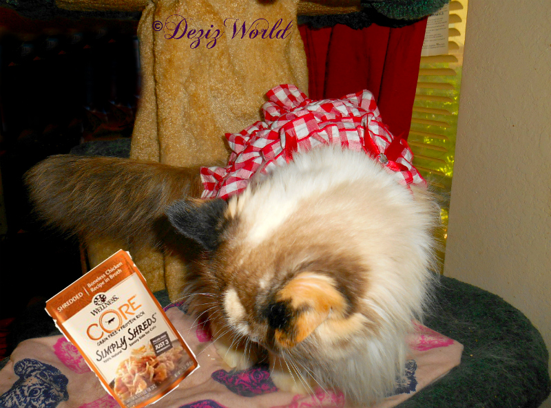 You sure did sissy. I’s waited ever so patiently fur mine’s turn to test it out. By the time you furinally let me try it, all that was left was shreds of chicken. You didn’t leave me, not one frop of that chicken flavored water. Fanky fankfully, mommy saw that and added some fur me. It was all purretty tasty ifin ya’ ask me. I’s would fur sure give the Wellness Core Simply Shreds 3 paws up. What ‘bout you sissy?