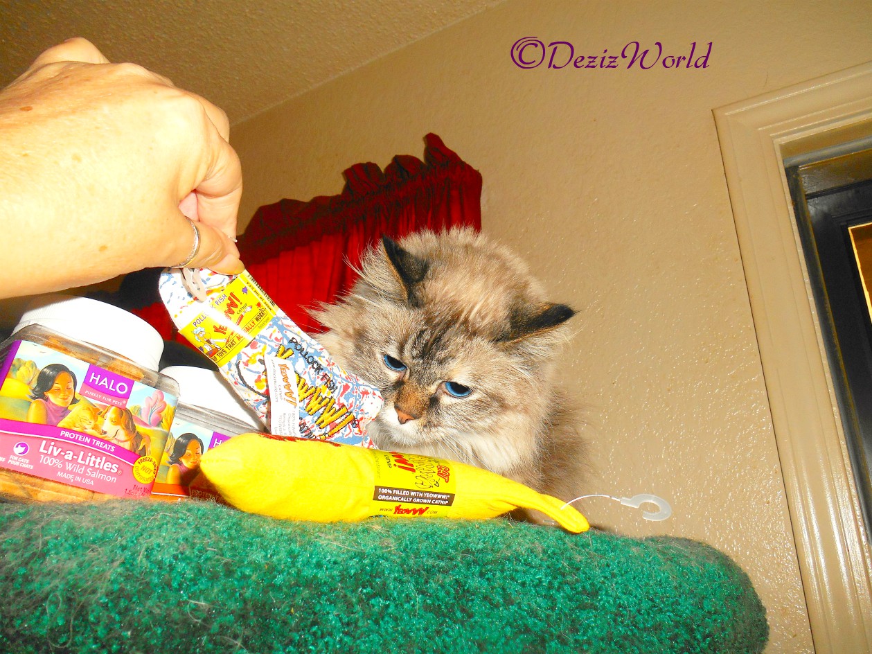 I’s ‘member sissy. So mommy furst offured it to me like a butter spoon. You know how much we luvs a good butter spoon. But, I’s wan’t havin’ it either. So, mommy tried offurin’ it to me in one of our dinner plates. I’s moved in fur a good sniff and then backed away slowly. It kinda looked like the stinkies all over our bloomers and smelled a bit like it too. Mommy even tried smooshin’ some of it on the tip of mine’s nose so I’s would have to lick it. I’s sure fooled her. I’s shook mine’s head and swiped with mine’s paw till it was all over the floor. Then, I’s went to the bathroom and cleaned mine’s paw off in her teethies holdin’ coffee cup. I’s’ll show her, I’s thought. MOL