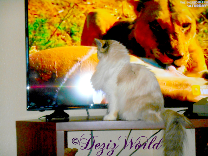 Hey, is anypawdy out there? It’s me, RaenaBelle. I’s gotta tell ya’, that chatter box mommy calls a teevee, sure has some great shows. I’s seen kin folk of all kinds this past week. I’s saw a leopard, a cheetah and of course, mine’s favorite, the lions.