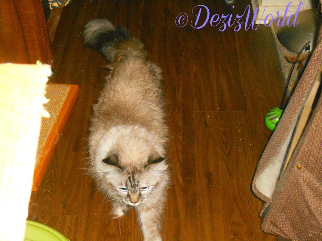 (Dezi stops and nonchalantly scratches her ear) Me doesn’t know why you run Raena. Me is helpin’ mommy. Me’s checkin’ fur those pesky intruders that scare her. You know, the last thing we’d want is fur mommy to get scared with our brekky plates. Now that wouldn’t be purretty. Anyways…(Suddenly, the lawn crew’s back, right outside the door and a rock hits the window, and then another and another; till Dezi runs off back down the hall. Raena sits and looks bewildered at first and then runs to the hall and into Dezi)