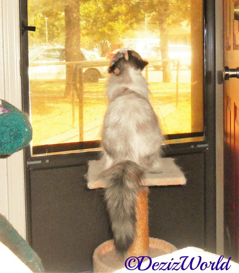 What ifin mommy already got you one, sissy? We’ve got a big box in the hallway to review that mommy says is gonna be your birthday surpurrise. Seems that should be enuff. (Hearing muffled talking outside Raena runs to the perch to look outside) Hey sissy, do you think we have a new neighbor already?