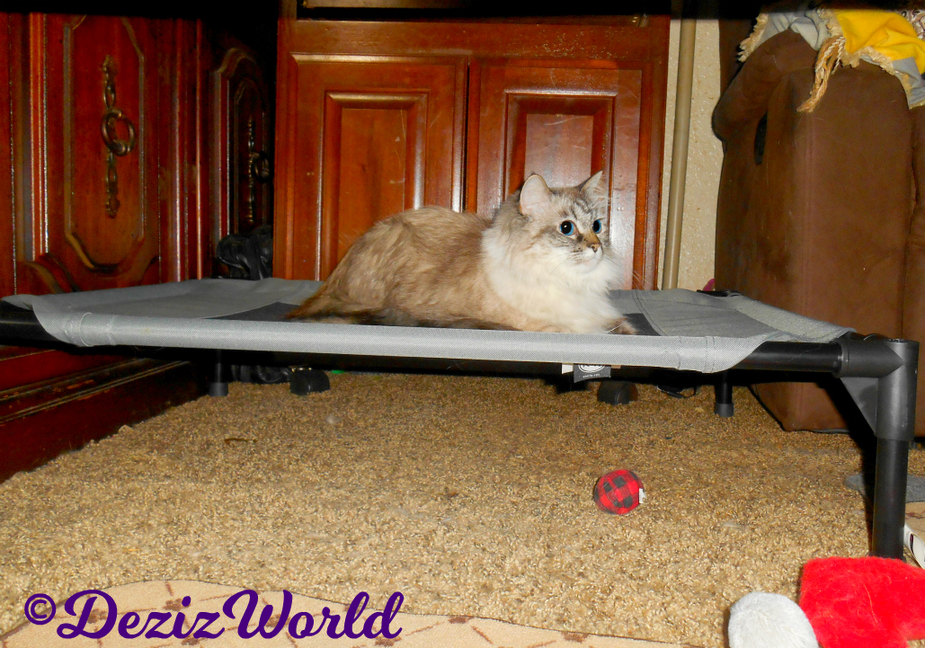 Yep sissy, I’s was concerned fur a minute that she was gonna take a nose dive right in the middle of it when she was tryin’ to attach the canopy. Ya’ know, mommy has broken a few of our toys by fallin’ on ‘em. Fanky fankfully, she managed to keep both feet on the floor. Guess we oughtta wrap it up fur now. Mommy says she has lots of human things to do befur the end of this month. That means she’s only got one more day. Maybe I’s can enjoy a little nap on the new pet cot since mommy’s put the camera away.