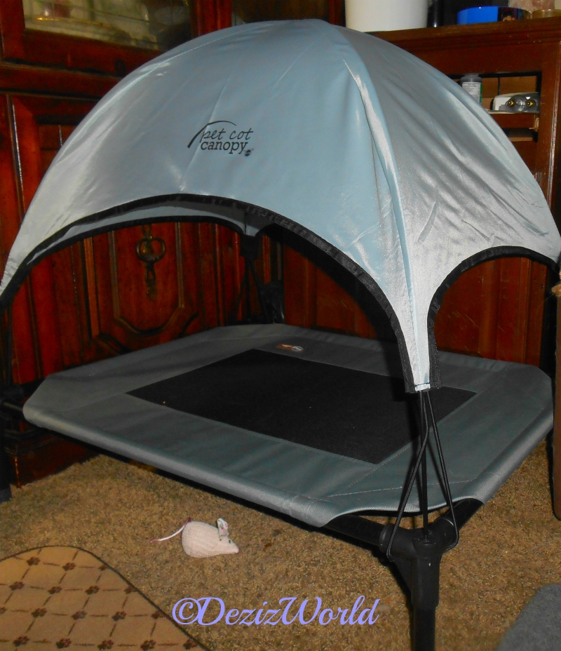 Me ‘members Raena. She was squealin’ somethin’ ‘bout how cute and how much we were gonna luv it. Me can tell ya’ what me did luv…watchin’ mommy fallin’ all over herself tryin’ to put that nifty canopy on our new pet cot from K&H Pet Products.