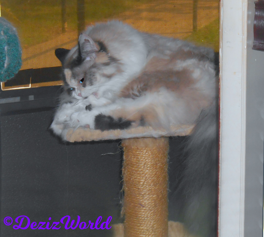 Hey everypawdy, it’s me, RaenaBelle. C’mon sissy, we’ve got lots to meow ‘bout today. Includin’ the title of our posty. What’s up with the Sort of? I’s know you’re mine’s BFF, and I’s yours…right? Anyways, the lawn crew’s gone, I’s purromise. (Raena licks her paw and takes a morning bath while sitting on the small perch at the door. Dezi walks into the living room and heads for her breakfast plate when suddenly she hears the blast of the leaf blower on the front porch. She stops in her tracks, flattens to the ground and looks around before running down the hall to the bedroom.) Sissy!!! Come Back!!!