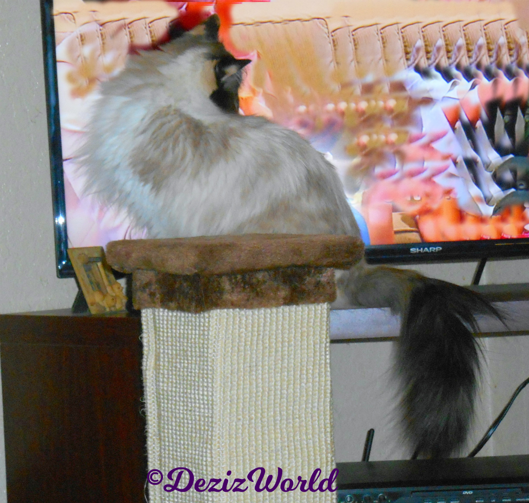 What? Hmmmmpht We’ll see, you ain’t in control of the remote, mommy is. Anyways, we’re all up now, so do you wanna play? Sissy…? Sissy…? (Raena sees Dezi asleep atop the cat tree) Hmmmmpht you’re all gonna sleep your lives away. (Raena stretches and yawns) Guess a mid meownon’ nap couldn’t hurt. This is RaenaBelle, signin’ off from the Three Belles Ranch. See ya’ll after a little nap.
