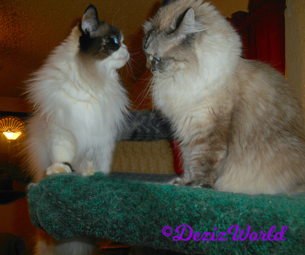 Dezi and Raena face off lovingly atop the liberty cat tree