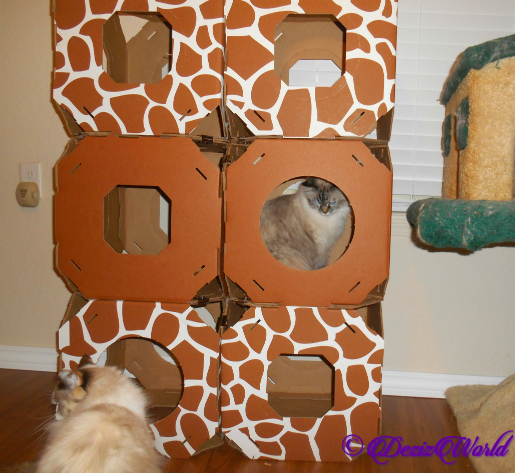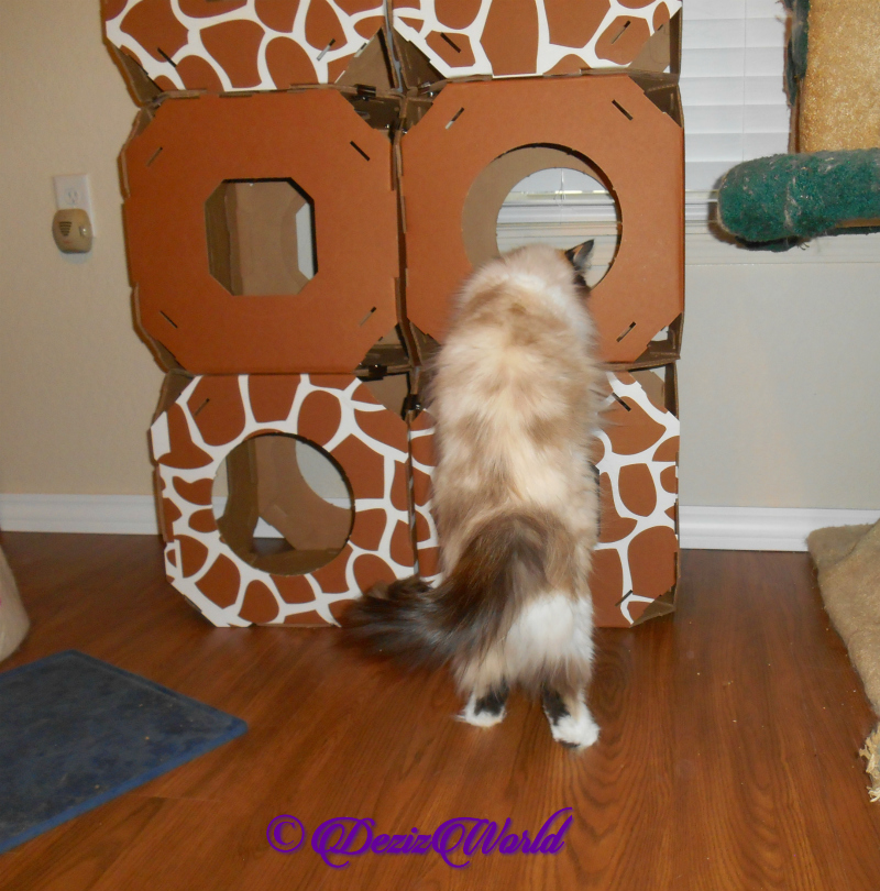 Yeah sissy, even I’s wouldn’t check out the bridge. So, mommy took out the bridge and stacked our Stacks on top of each other. Each box has pre purrfurated holes in two sizes to accommodate smaller and/or larger kitties like ourselves. Mommy enlarged a couple of holes and left some in tact so we could have a solid bottom to sit on. The Stacks have “clips” that help to secure them in place. Mommy wasn’t sure they were gonna work, but they do a purretty good job.