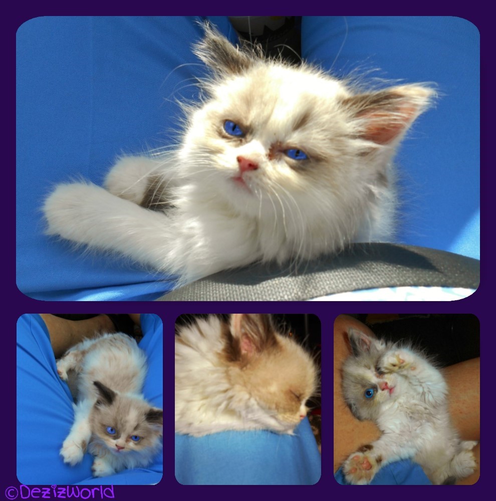 But mostest ‘purrtantly, she luvs me’s mommy. She wants to be right with mommy everywhere. So maybe she ain’t dat bad after all. She saw da VET on Fursday when me did and she got a clean bill of health. Her eye and nose is somethin’ mommy be watchin’ to make sure it clears up on it’s own as it wasn’t serious enuff fur medicine at this time. She weighs a whole pound and a half and was born on April 21st. She’s a bi-color Ragdoll, but her points aren’t clear enuff to call yet. Mommy says she has flame patch on her ear just like me does. Another story fur another day.