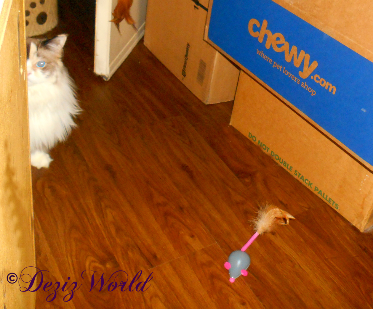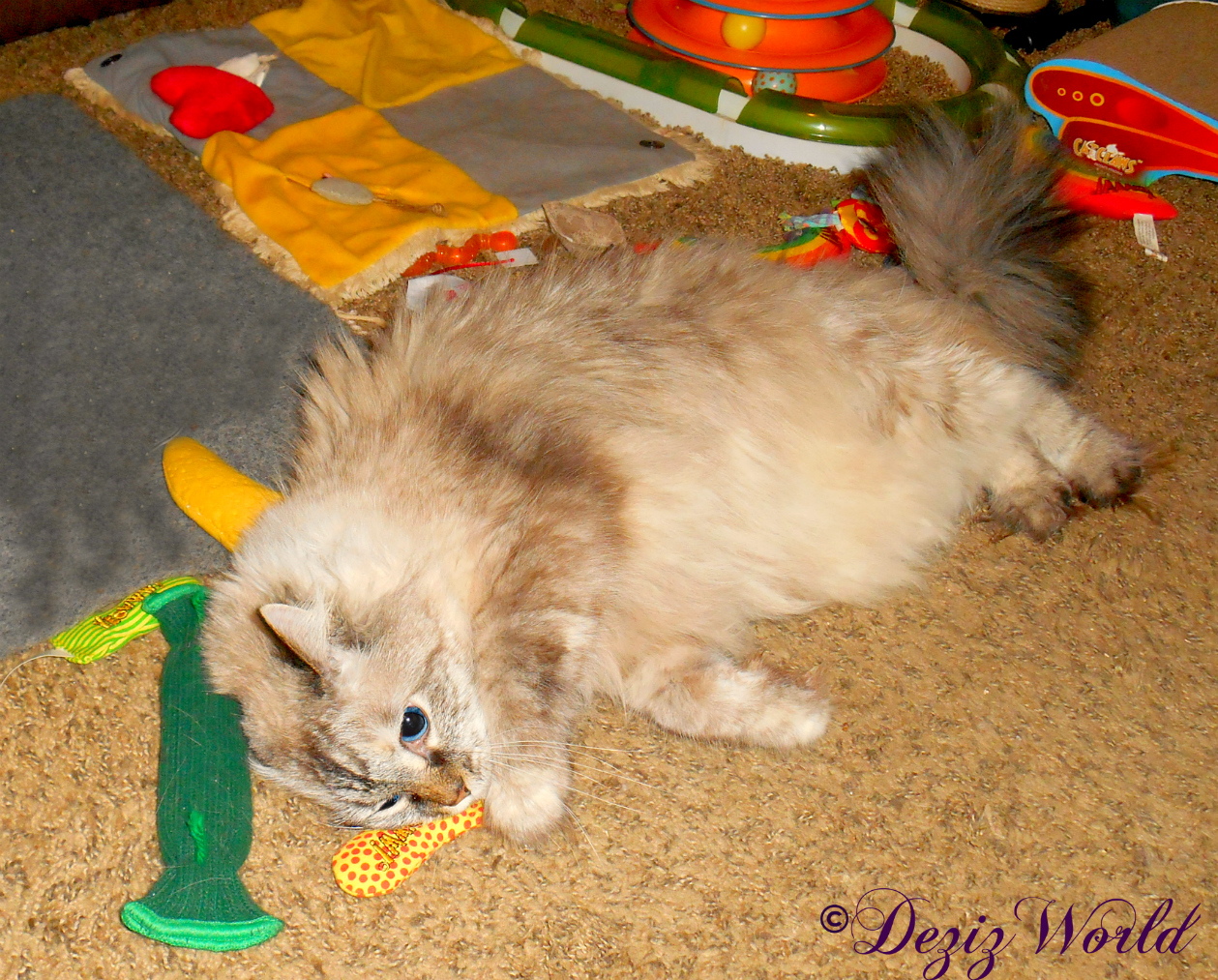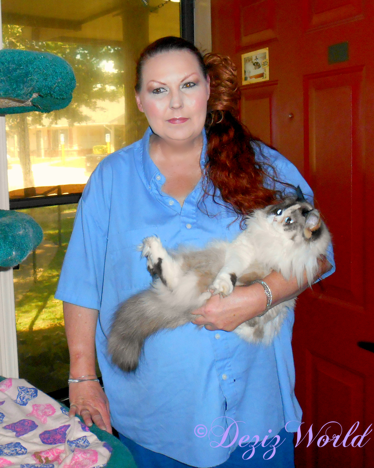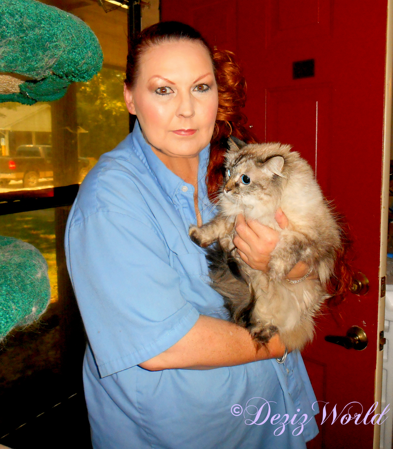 Sorry mommy. (Dezi and Raena meow their apology in unison) I’s had so much fun. At furst I’s wasn’t sure ‘bout whether or not to trust ‘em, but that awnty Elizabeth be so nice and gentle. She luvved mine’s furs and kept sayin’ how purretty I’s am.