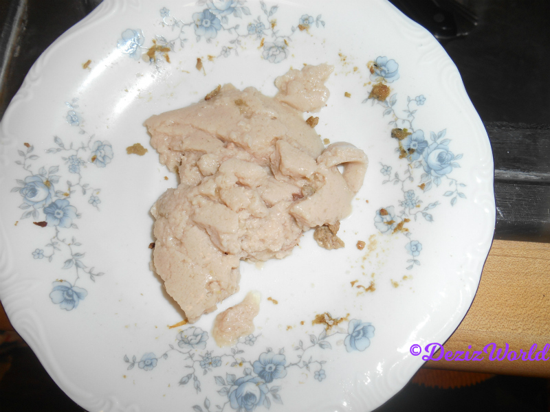 We received a variety pack with 2 of each flavor inside along with a couple of fun crinkle balls. Fanky fanks fur the crinkle balls, we luvs playin’ with ‘em. Pawrently mommy’s old eyes missed the whole pate’ thing, cuz we don’t really like pate’. But, mommy thought we oughtta give ‘em a try anyways. Since we don’t like fish, mommy opened us a bag of just plain chicken and slid it onto our dinner plate. It literally slid outta the pouch in 1 solid piece. Not a lick of gravy in sight. Anyways, mommy cut the blob in half and put it on another plate fur me. She used the spoon to separate it a little and served it to us fur dinner. We tend to eat heartier at dinner time, so mommy’s always tryin’ to introduce new noms durin’ that meal. You’d think she’d learn by now, but I’s guessin’ this won’t be the last time we see somethin’ new on our dinner plates. Mommy says it’s good to offur kitty a variety of noms so we don’t get too picky. Hmmmpht What does she know. Ifin we’re eatin’ good, why mess with purrfection?