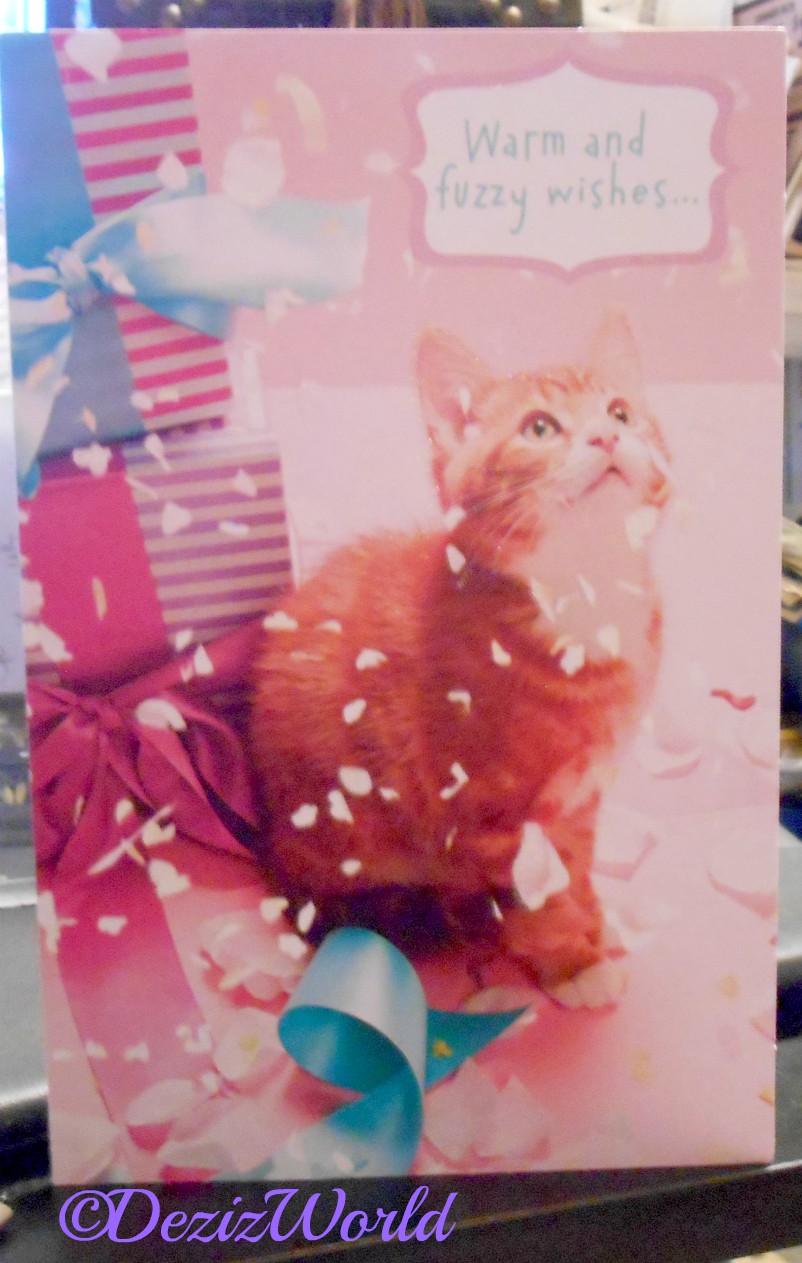 Me’s also been blest with the bestest furiends in the universe. Me got some great cards fur me’s birthday that me wanted to show off. Fank you fur the pawsum cards, me luvved ‘em. Don’t furget to enter me’s birthday give away here. Check out me’s card from Valentine here. And click here to see the card from awnty Vonda.