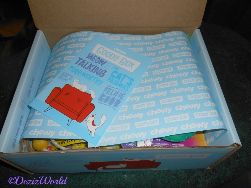 We were really x’cited to be among the furst kitties to receive one of these great boxes, and just in time fur sissy’s birthday no less. And think ‘bout it, Christmas is just ‘round the corner. These Goody boxes would make a great gift, even fur those far away from ya’. Just place your order and have Chewy ship it to the kitty or woofy of your choice, within the U.S. of course. And then sit back and relax. You’re not obligated fur future shipments. Mommy always says, it’s so nice to receive gifts, but nopawdy but her took us on to raise. So, ifin ya wanna send a surpurrise gift every once in a while, these are purrect. You didn’t sign up fur a life long commitment with the Chewy Goody Box. And just look’it all the goody’s in the box.