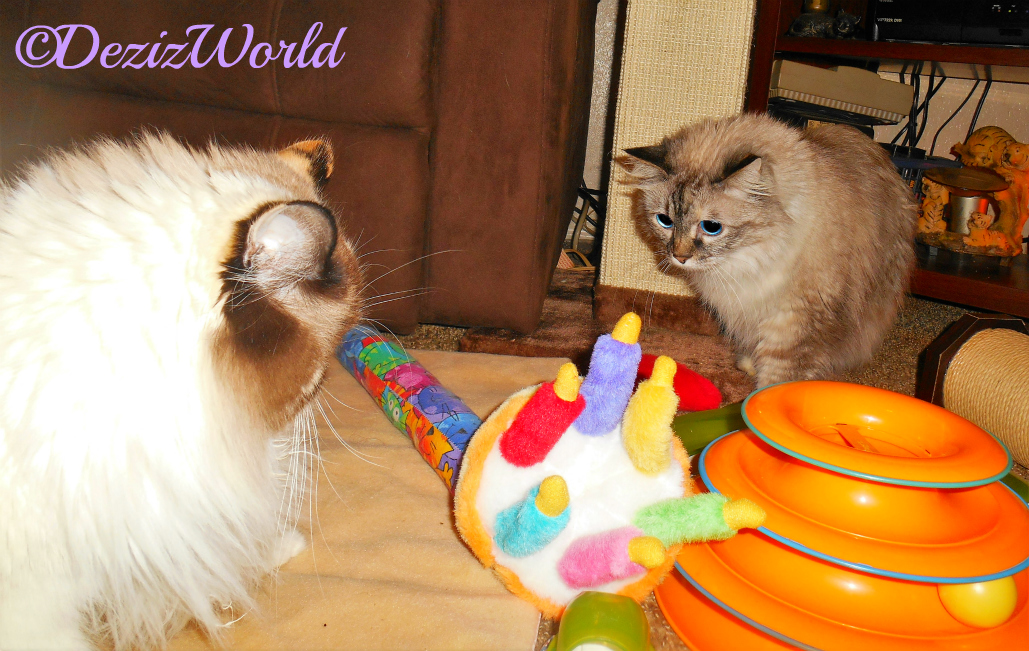 (Dezi starts to rumble <purr> and meow. She runs down the cat steps through the house and back to the bed meowing) WooHoooooooo It’s Me’s Birthday!!! Wake up Raena and help me with mommy so we can get me’s Birthday started!!! It’s gonna be a furtabulous month!!!