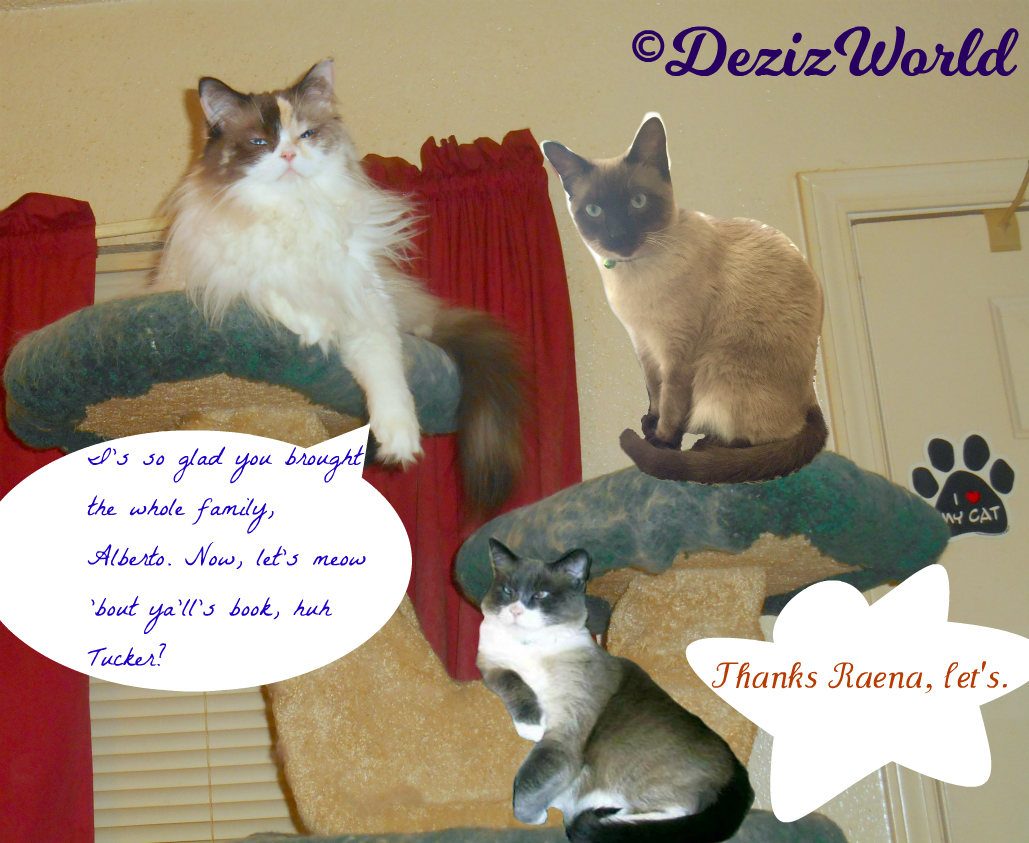 Alberto:  Thanks Raena and Dezi, we’re happy to be here to talk about our book and play with you girls. I of course am Alberto, adventure cat extraordinaire; the *lean mean stalking machine of the Tribe (*Felines Opine). The Alpha of our Tribe is my rotund cross eyed brother, Tucker. His cuddle buddy is our sister Lily, who like you beautiful ladies is a torbie with catitude. The black and white spotted fellow rolling in your nip is my brother Oliver. And last but certainly not least is our sister, Jasmine. (Whispers) You know, she’s the scaredy cat of the Tribe. (Alberto meows loudly from the cat tree) But that’s okay, we’re trying to incorporate some of the tips you all gave us to integrate her back into the family area.