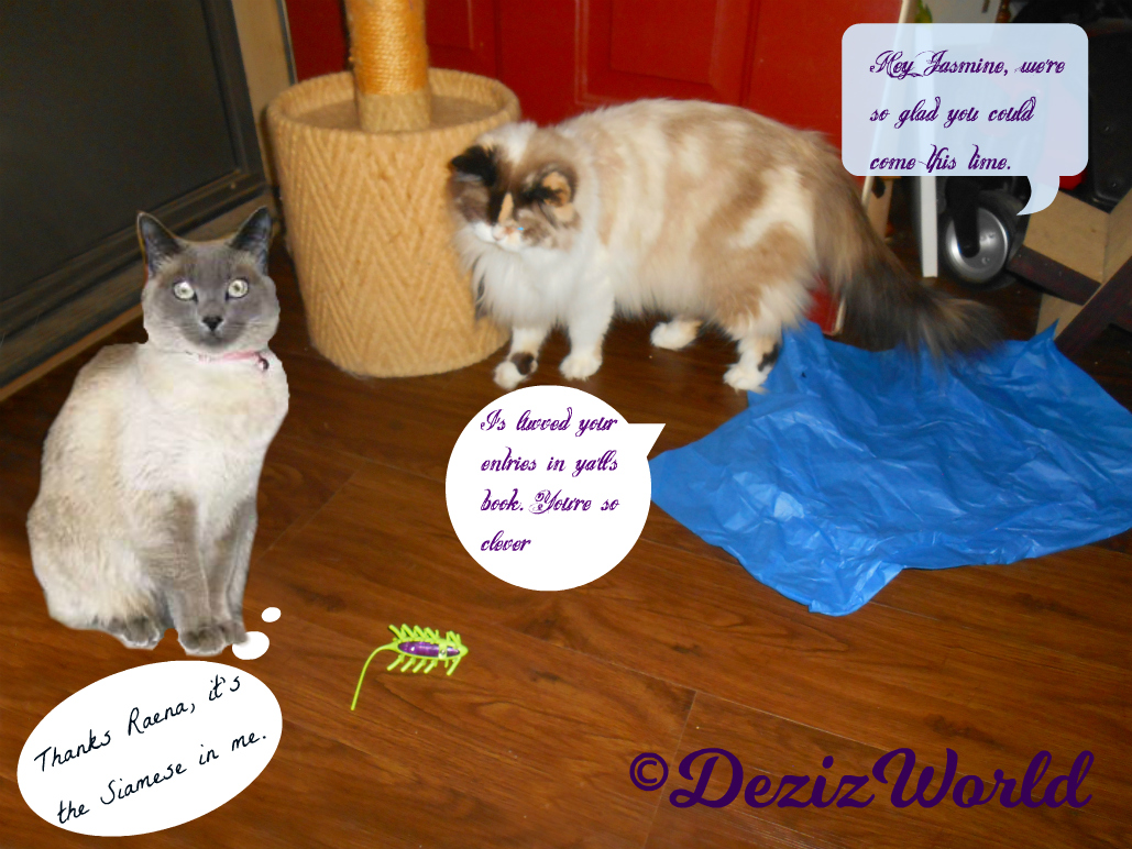 Dezi:  We sure were Raena. We cats have to stick together. So, when we heard their book was “on sale now”, we invited ‘em over fur a play date and told them to bring a copy of their new book, Felines Opine, to discuss. They were so generous, they had their human, “awnty” Anita Aurit (author and the Tribe’s scribe) send us our very own hard copy.  Pawtographed and purrsonalized just fur us.